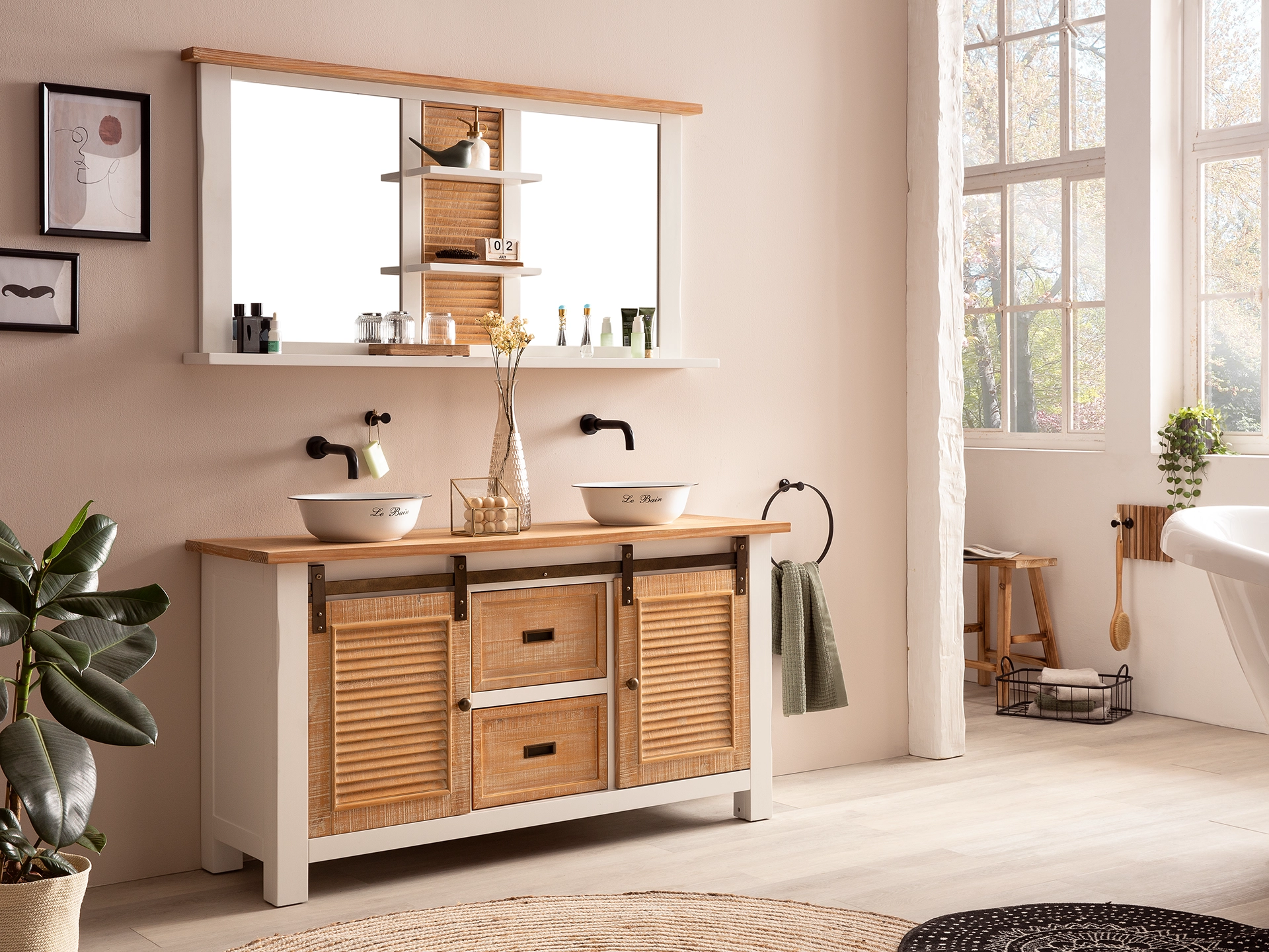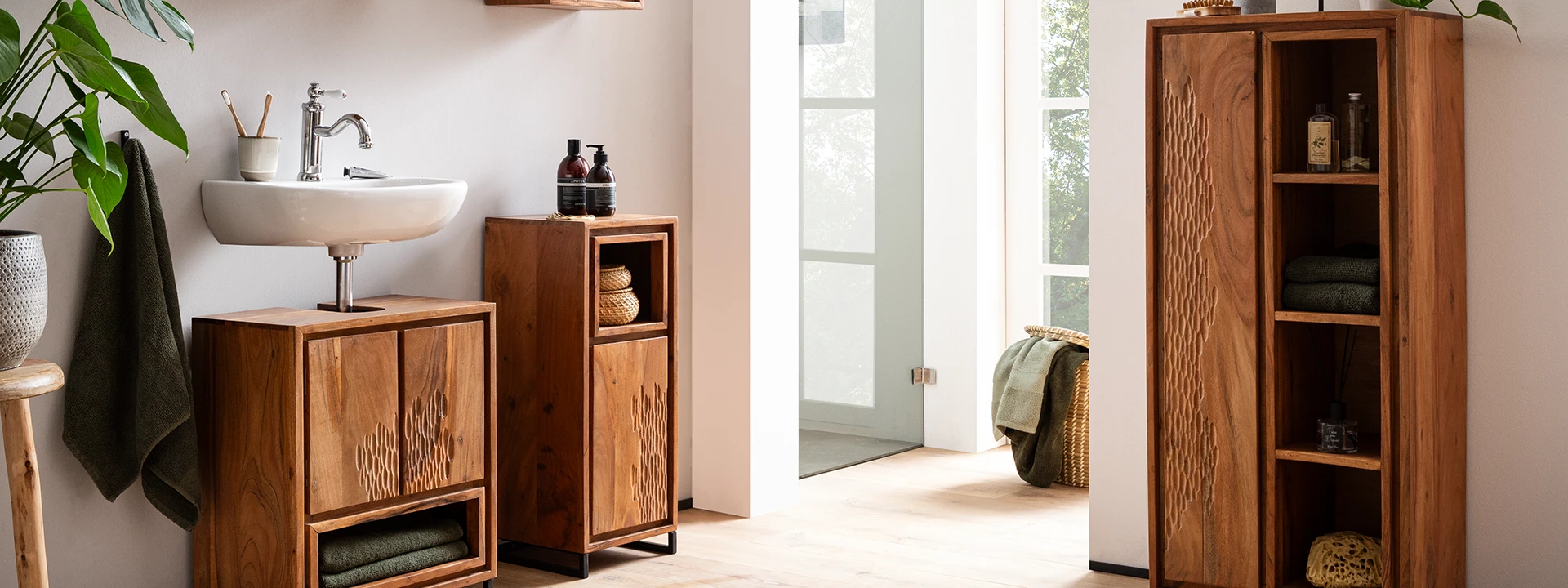 - Auch im Badezimmer bedarf es einer entsprechenden Möblierung. Gerade im Kontrast zu glatten Fliesen- und Keramikoberflächen bieten Möbel aus Echtholz hier die Möglichkeit Behaglichkeit zu schaffen. In der Auswahl Badmöbel aus Holz sind neben Schränken und Spiegeln auch Badaccessoires wie Handtuchhalter und Wäschekörbe zu finden. Das Design in diesem Wohnbereich zeichnet sich dabei durch deutlich hellere Farben und zurückhaltendere Formen aus und verleiht dem Badezimmer so die nötige Leichtigkeit.