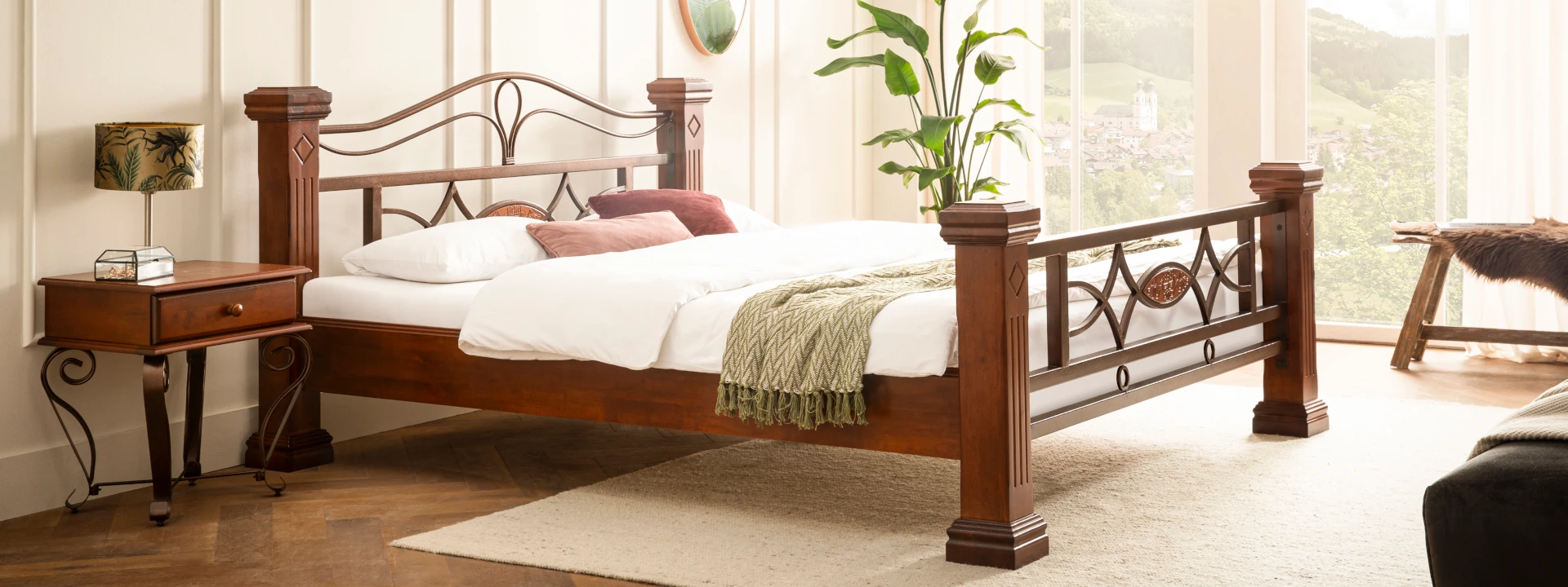 Wenn der Abend zur Ruhe kommt, sorgt das Schlafzimmer für entspannten Rückzug: robuste Betten aus Massivholz (180×200cm), großzügige Kleiderschränke aus Echtholz und praktische Kommoden aus Massivholz schaffen eine stimmige Wohlfühl-Atmosphäre.