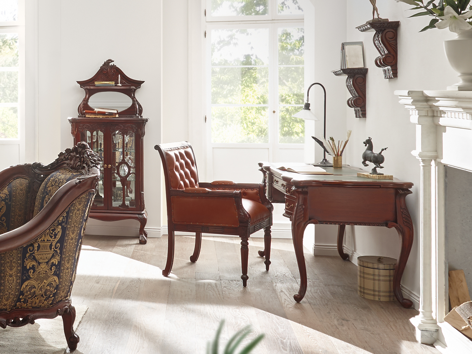Der Esszimmerstuhl im klassischen englischen Stil passt sowohl als Schreibtischstuhl als auch als Esszimmer-Möbel. Mit Maßen von 73x100x72 cm wirkt er präsent, ohne zu überladen, und bringt Wärme in Dein Zuhause oder als Teil von eleganten Büromöbeln.