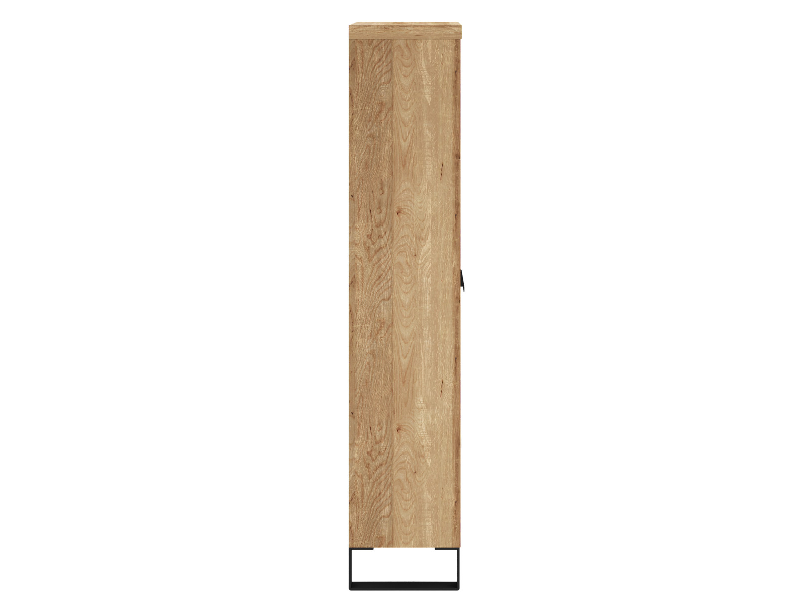 Die Griffe und Füsse aus schwarzem Metall geben dem Möbel festen Stand und ein industrielles Detail. Durch die Kombination aus Holz und Metall wirkt der Regalschrank stabil und hochwertig, perfekt für häufig genutzte Badezimmermöbel-schmal oder als langlebiger Flurschrank-schmal.