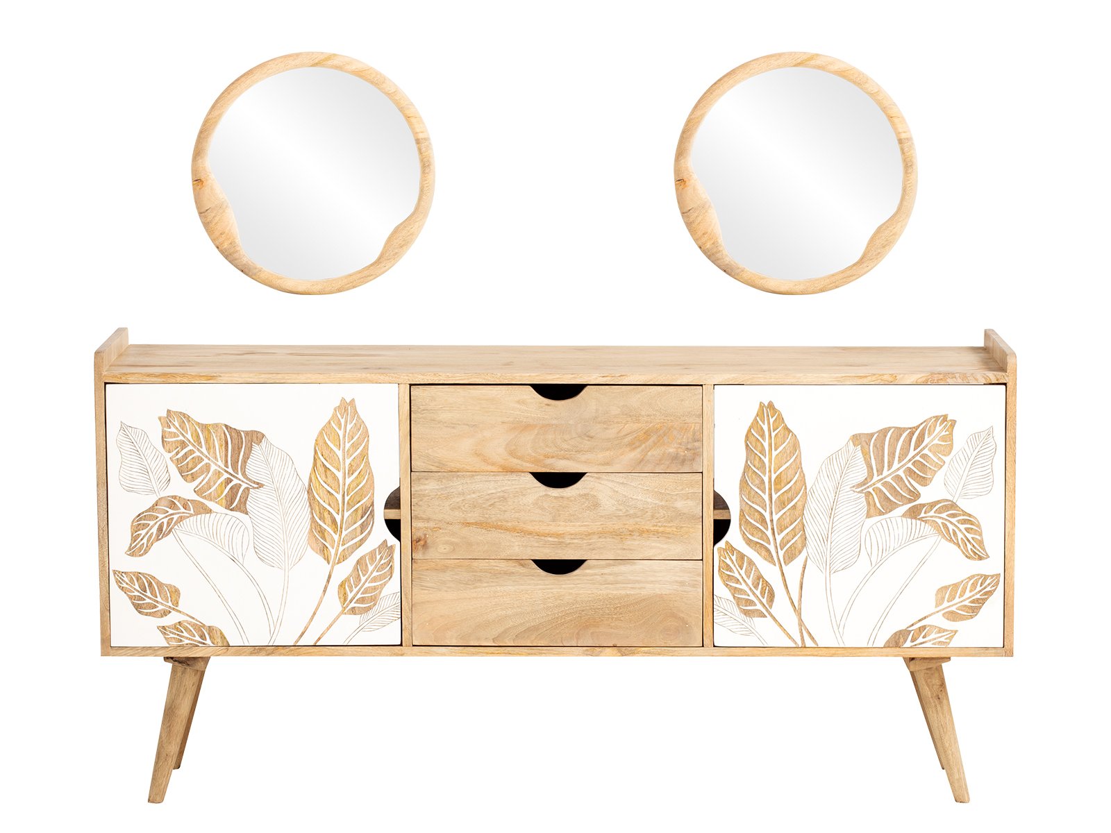 Das Badezimmer-Set besteht aus einem großzügigen Waschtisch mit Spiegel und zwei charmant organisch geformten Spiegeln. Die kunstvoll geschnitzten Türfronten mit weiß-goldenem Blattmotiv sind ein echter Hingucker und verleihen dem Set einen Hauch Exotik. Drei mittig angeordnete Schubladen mit praktischer Griffmulde bieten Platz für all Ihre Badezimmerutensilien – stilvoll und funktional.