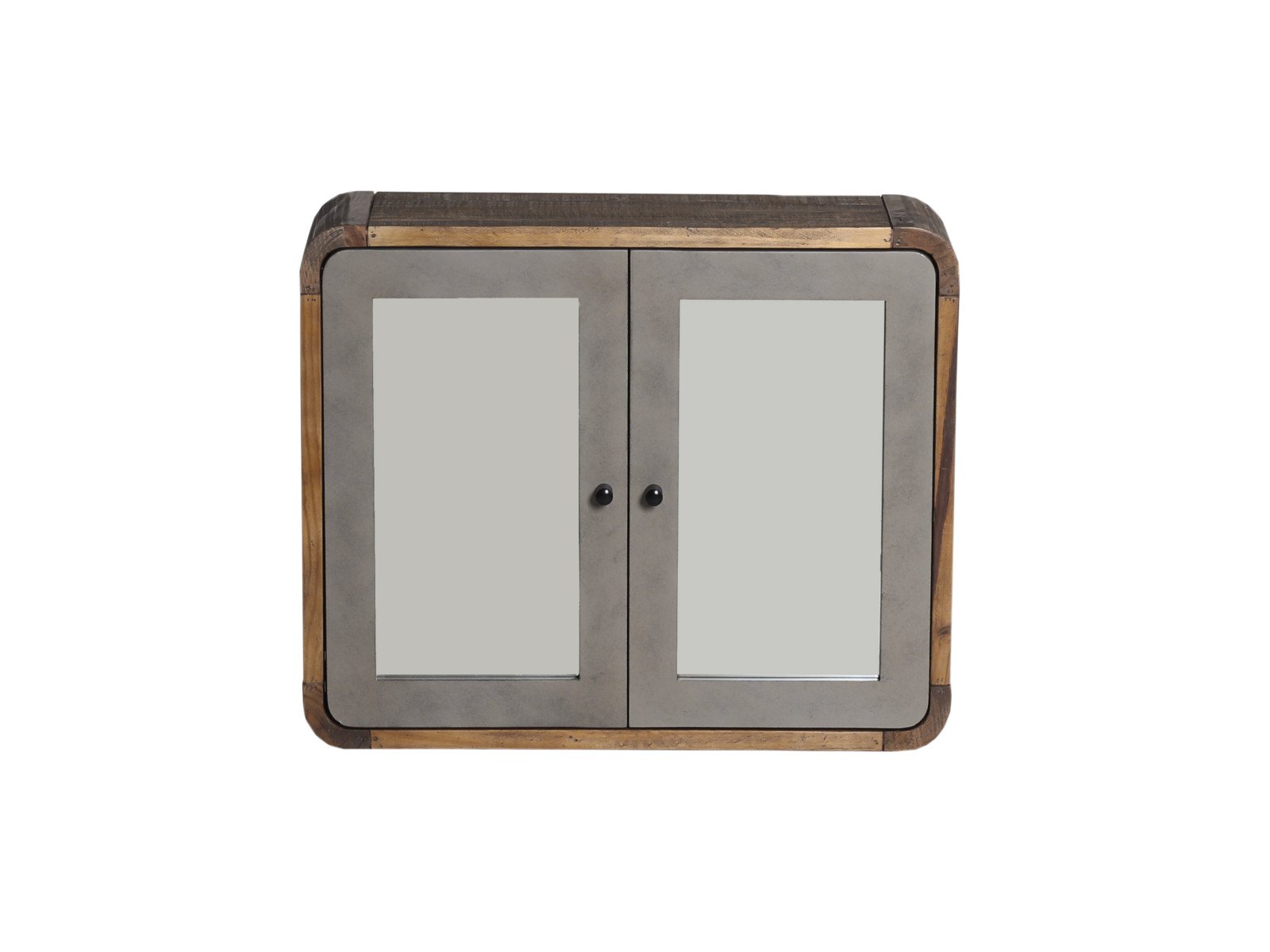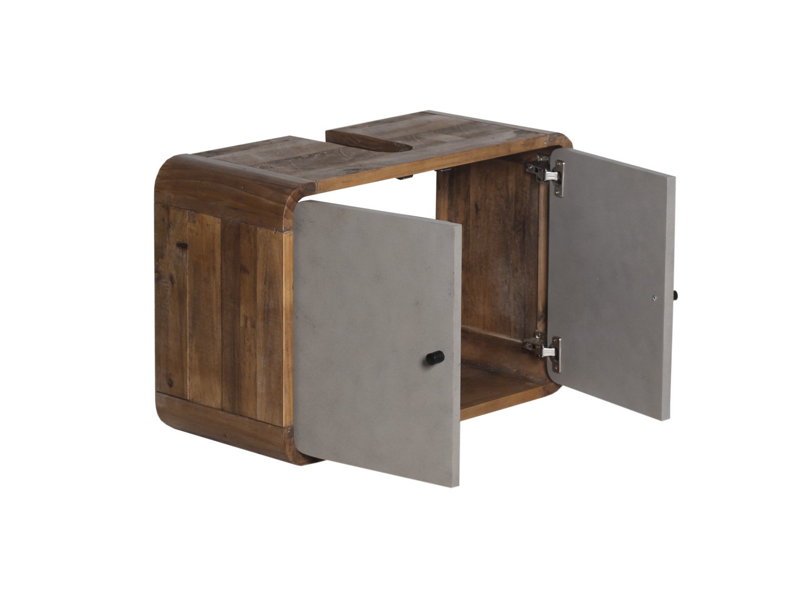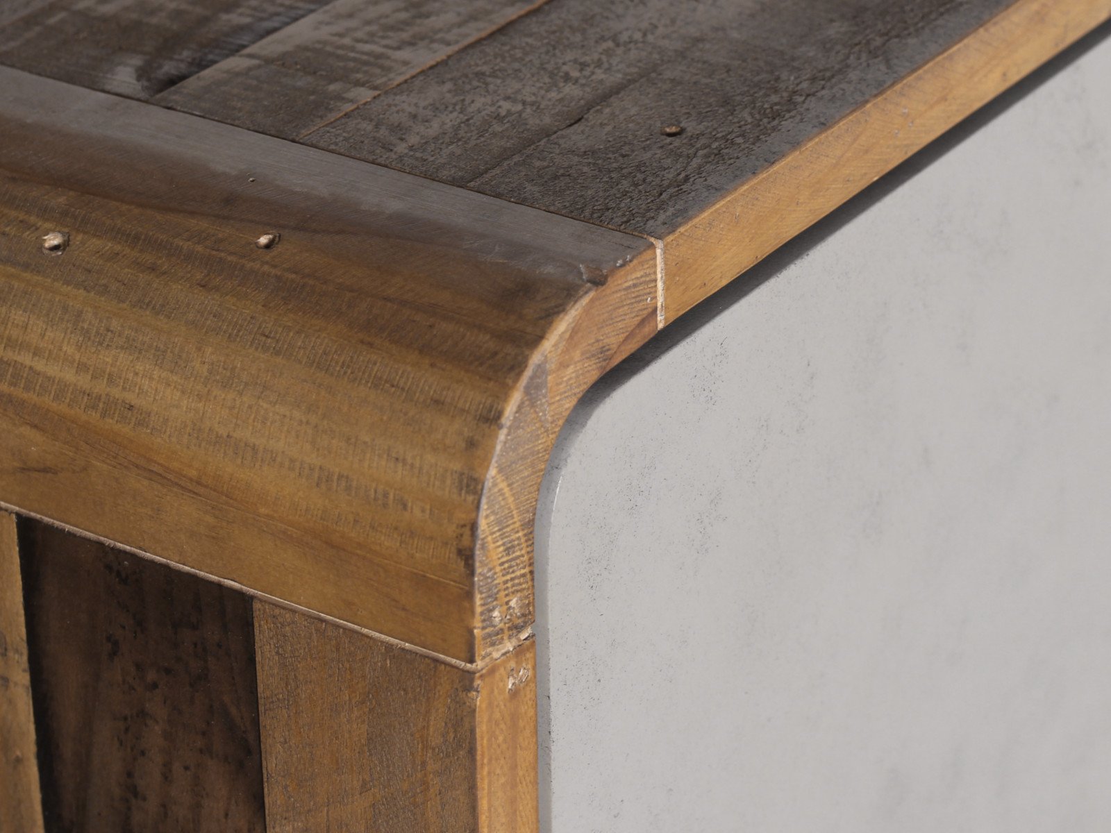 Die Möbel sind aus recycelter Pinie gefertigt und die Fronten haben eine graue Betonoptik. So trifft warmes Holz auf kühle Betonmöbel Optik. Du bekommst die Haptik von Massivholz und die moderne Ausstrahlung von Betonmöbel zugleich, ideal für rustikale und urbane Looks.