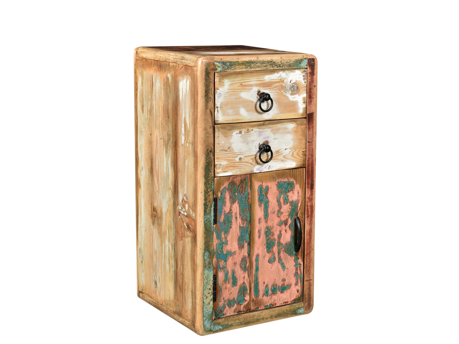 Wunderbarer Wohnstil – mit eigener Handschrift in einzigartigem Design. Unsere Badmöbelserie Kalkutta ist massiv aus recycelten Hölzern gefertigt welche vorwiegend aus alten Türen, alten Möbeln oder auch aus alten Fischerbooten neu verarbeitet wurden. Die Schwebeoptik, mit farbigen Flächen und Nostalgie-Feeling gibt jedem Raum eine faszinierende Note. Hinter den Türen und in den Schüben können Sie eine Menge Badezimmerutensilien verstauen. So finden zahlreiche Kleinartikel, aber auch Textilien wie Handtücher ihren Platz. Die matt lackierte Oberfläche dieser kompakten Schränke dient ebenso als Ablage für Badartikel oder Dekoration. Die Möbelstücke sind hochwertig von Hand gefertigt, mit eigener Geschichte und eigener Farbgebung. Das macht jeden Badschrank für sich zu einem Unikat.
