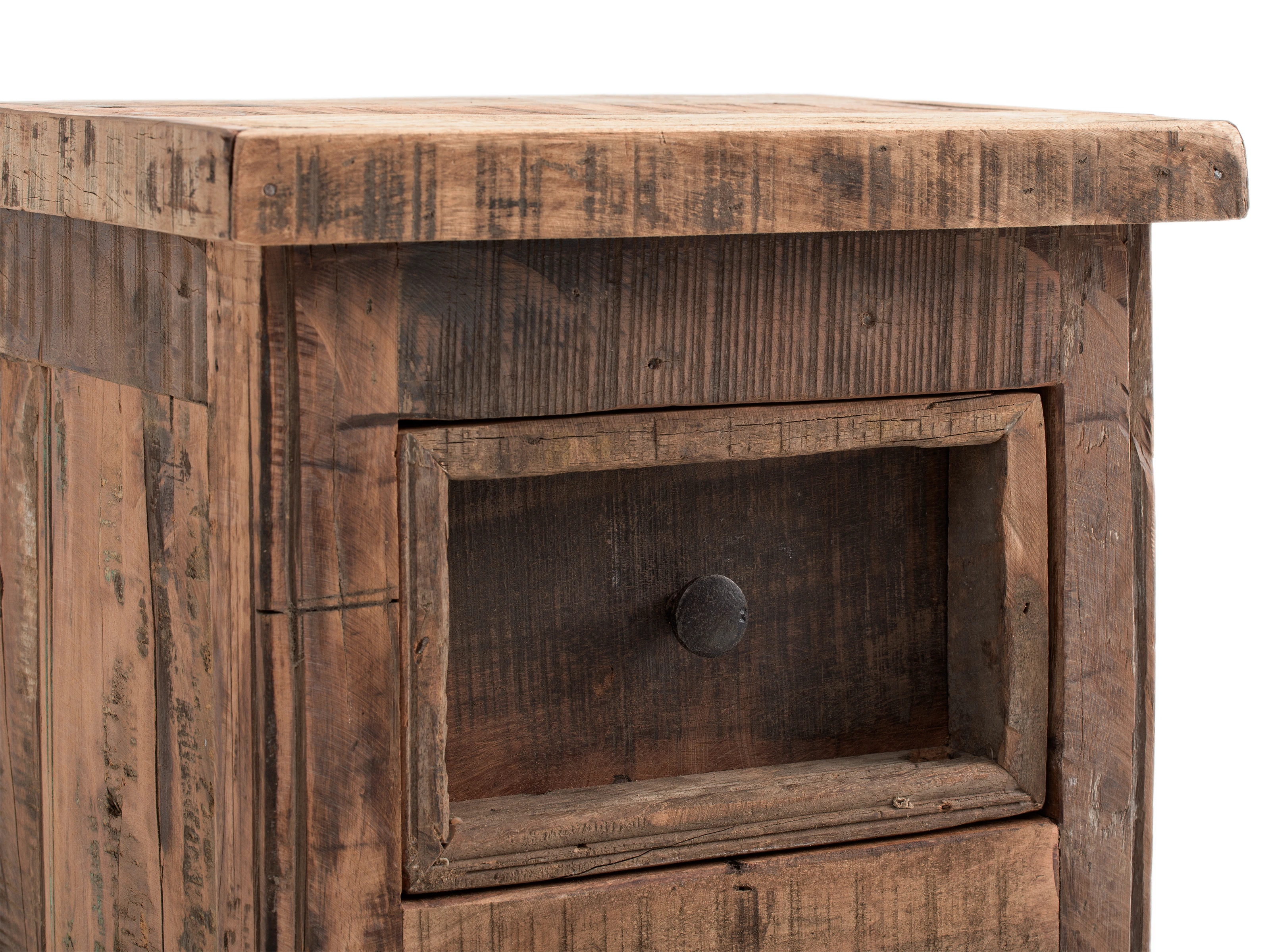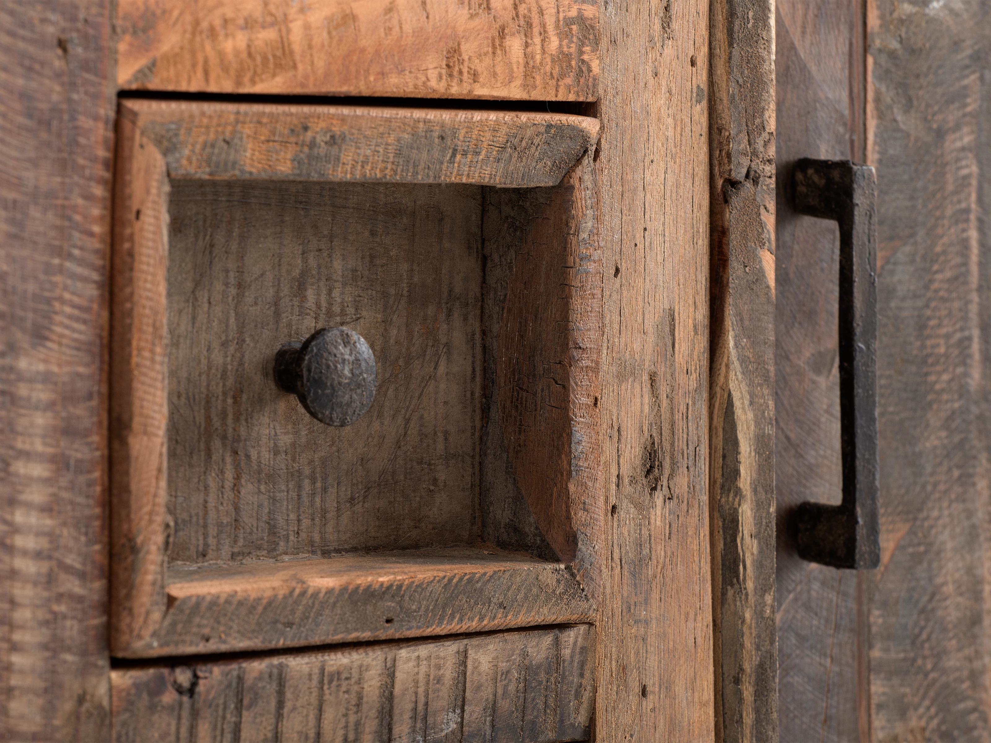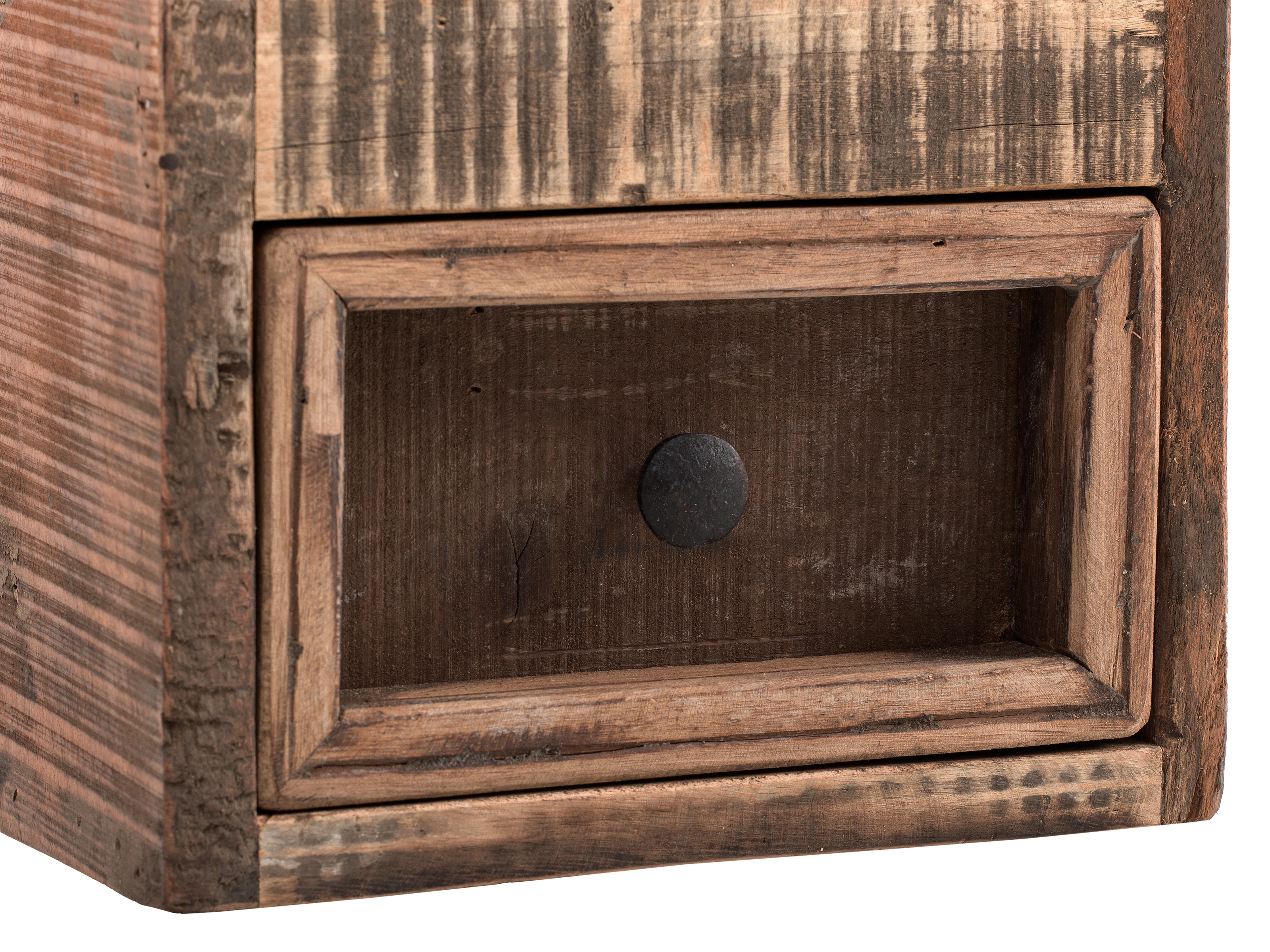 Verwandeln Sie Ihr Badezimmer in einen Ort der Behaglichkeit mit dem 4-teiligen Badmöbelset Sumatra. Gefertigt aus recyceltem Altholz, bringt jedes Stück rustikalen Charme und eine individuelle Note mit sich. Das Set umfasst einen Waschbeckenunterschrank, einen Spiegelschrank, eine praktische Badkommode und einen Wandschrank – perfekt für eine stilvolle Badezimmer-Einrichtung. Hinter Türen und in Schubkästen finden Sie reichlich Stauraum für Ihre Badutensilien. Die natürlichen Scharten, Holzrisse und Kerben verleihen den Möbeln ihren unverwechselbaren Landhaus-Charakter. Die Oberfläche bleibt unbehandelt, wodurch die authentische Struktur des Altholzes wunderbar zur Geltung kommt. Kombinieren Sie die Sumatra-Serie nach Belieben und schaffen Sie Ihre ganz persönliche Wohlfühloase. Jedes Möbelstück ist ein Unikat – genau wie Ihr Zuhause.