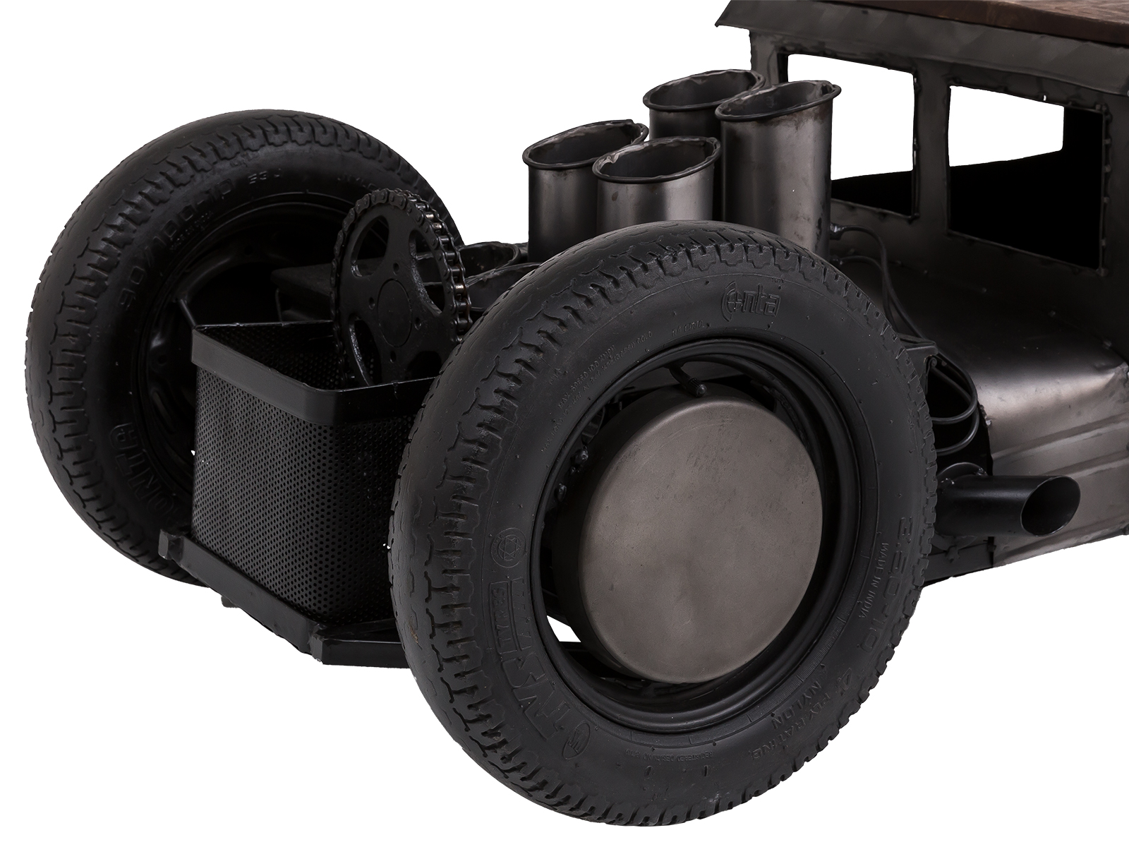 Das Hotrod-Design mit authentischen Rädern verleiht dem Tisch eine dynamische Ausstrahlung, während er stabil und fest steht. Jedes Stück ist ein handgefertigtes Unikat, liebevoll zusammengesetzt aus recycelten Materialien und Stahlblech. Dieser Couchtisch vereint Vintage-Charme mit der Qualität von Echtholz und ist das perfekte Möbelstück für alle, die das Besondere suchen.