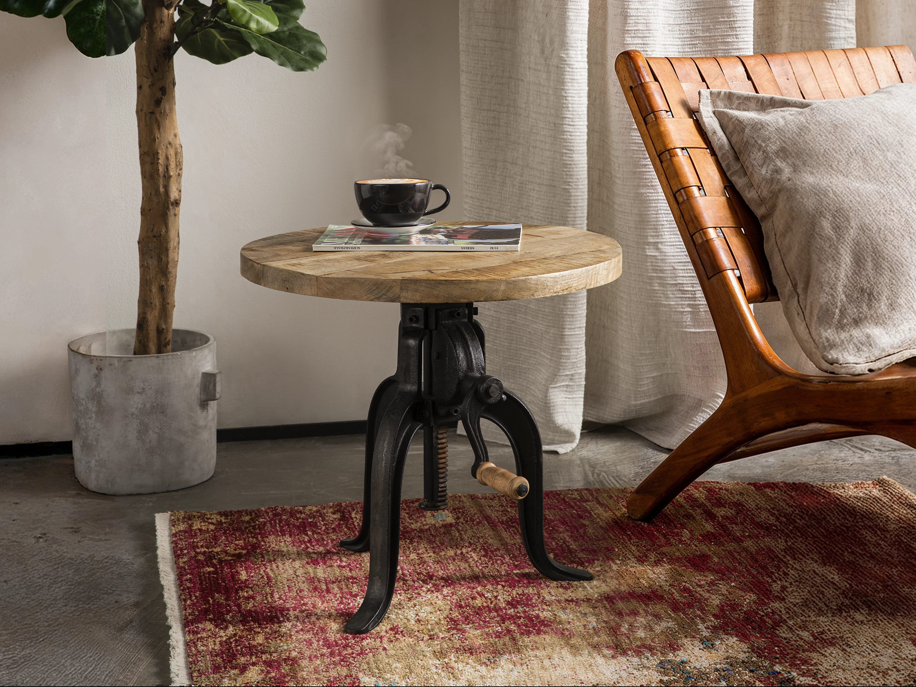 Mit dem höhenverstellbaren Couchtisch Wasel aus edlem Mangoholz setzen Sie stilvolle Akzente in Ihrem Wohnzimmer. Die runde Tischplatte mit einem Durchmesser von 50 cm bietet ausreichend Platz für Ihre Lieblingsdekorationen, während das robuste Metallgestell in moderner Optik für Stabilität sorgt. Dank der praktischen Kurbel lässt sich die Höhe von 45 auf 60 cm flexibel anpassen – perfekt für kleine Sofas, Sessel oder gemütliche Leseecken.