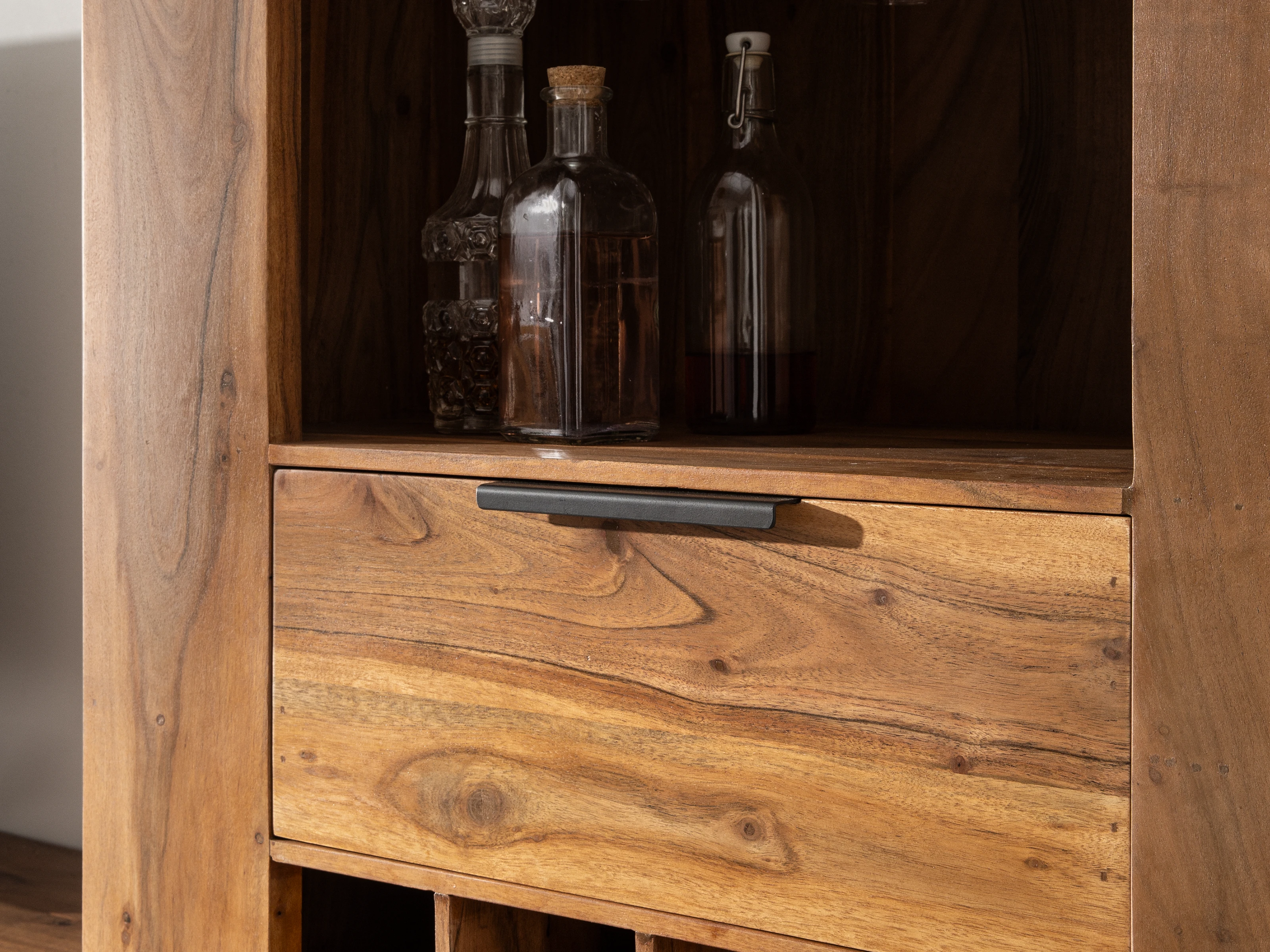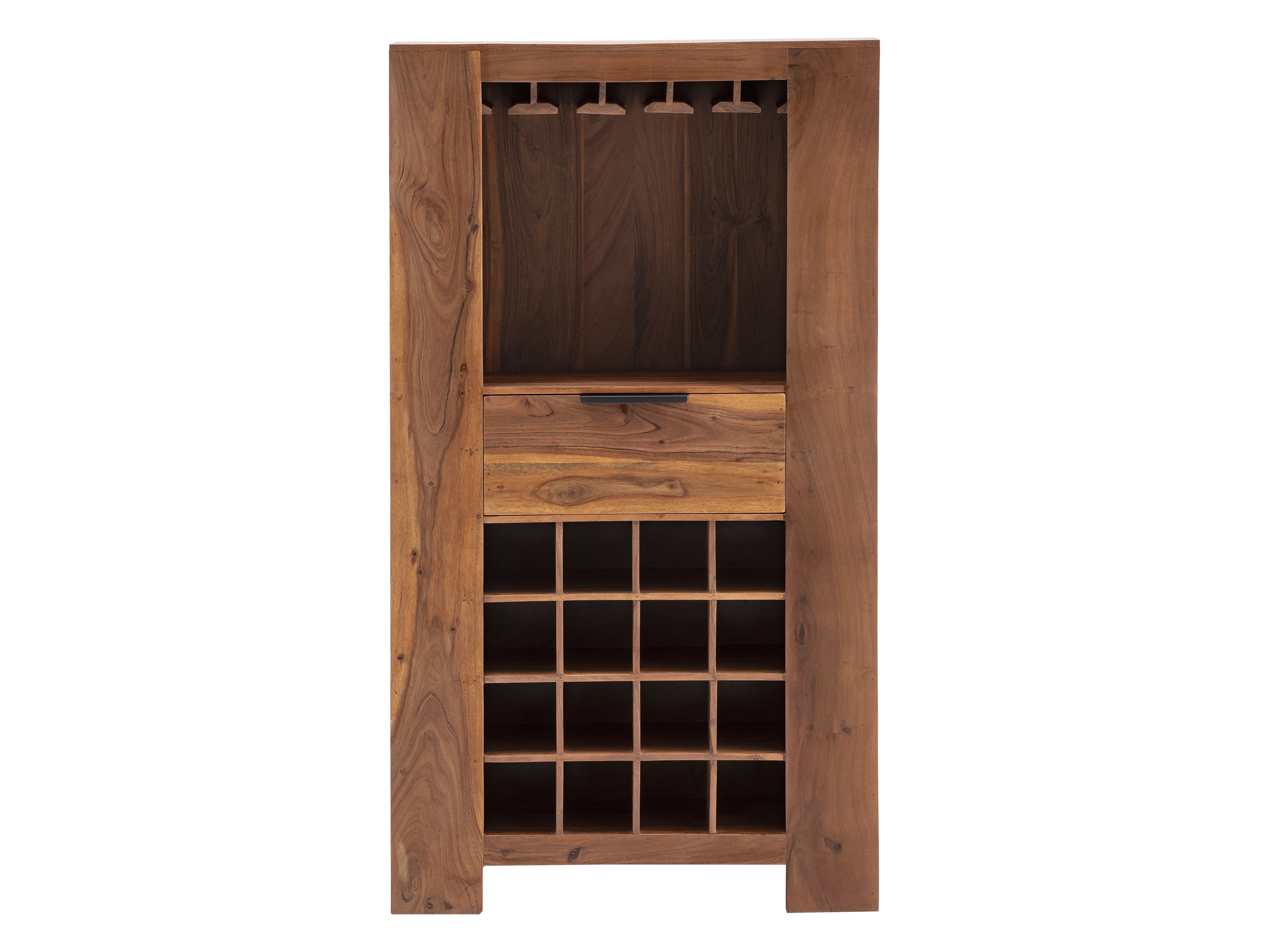 Entdecken Sie mit dem Highboard Osbon einen wahren Allrounder aus massivem Akazienholz. Mit seinen Maßen von 80 x 145 x 45 cm bietet es nicht nur ausreichend Stauraum, sondern auch vielseitige Nutzungsmöglichkeiten. 16 Flaschenfächer, ein geräumiger Schubkasten, ein offenes Fach und eine Glashängung sorgen dafür, dass Ihre edlen Tropfen stilvoll präsentiert werden. Ob als Weinschrank im Wohnzimmer, Flaschenregal in der Küche oder als Blickfang in Ihrer Hausbar – das Highboard Osbon setzt Ihre Räume in Szene.