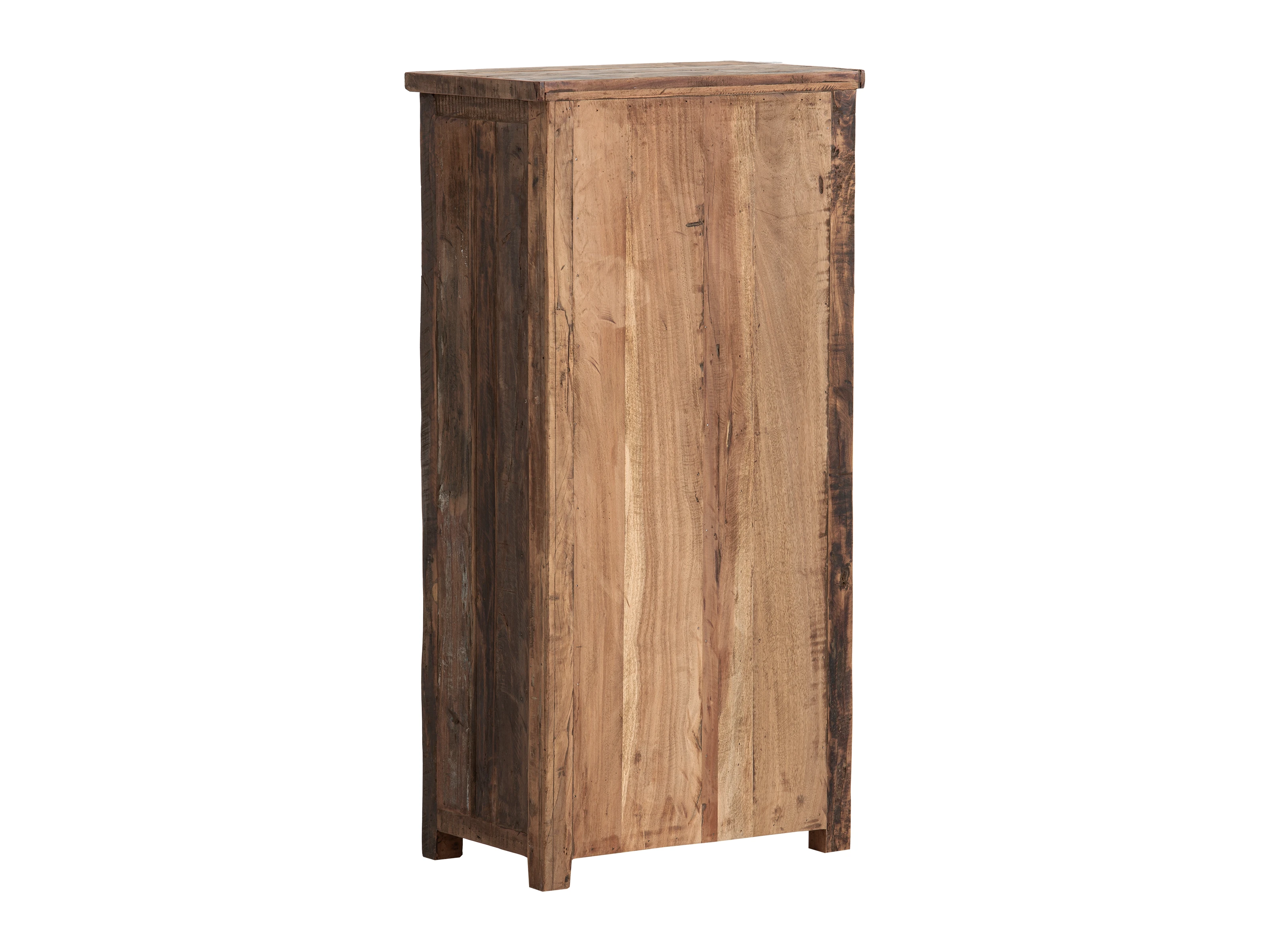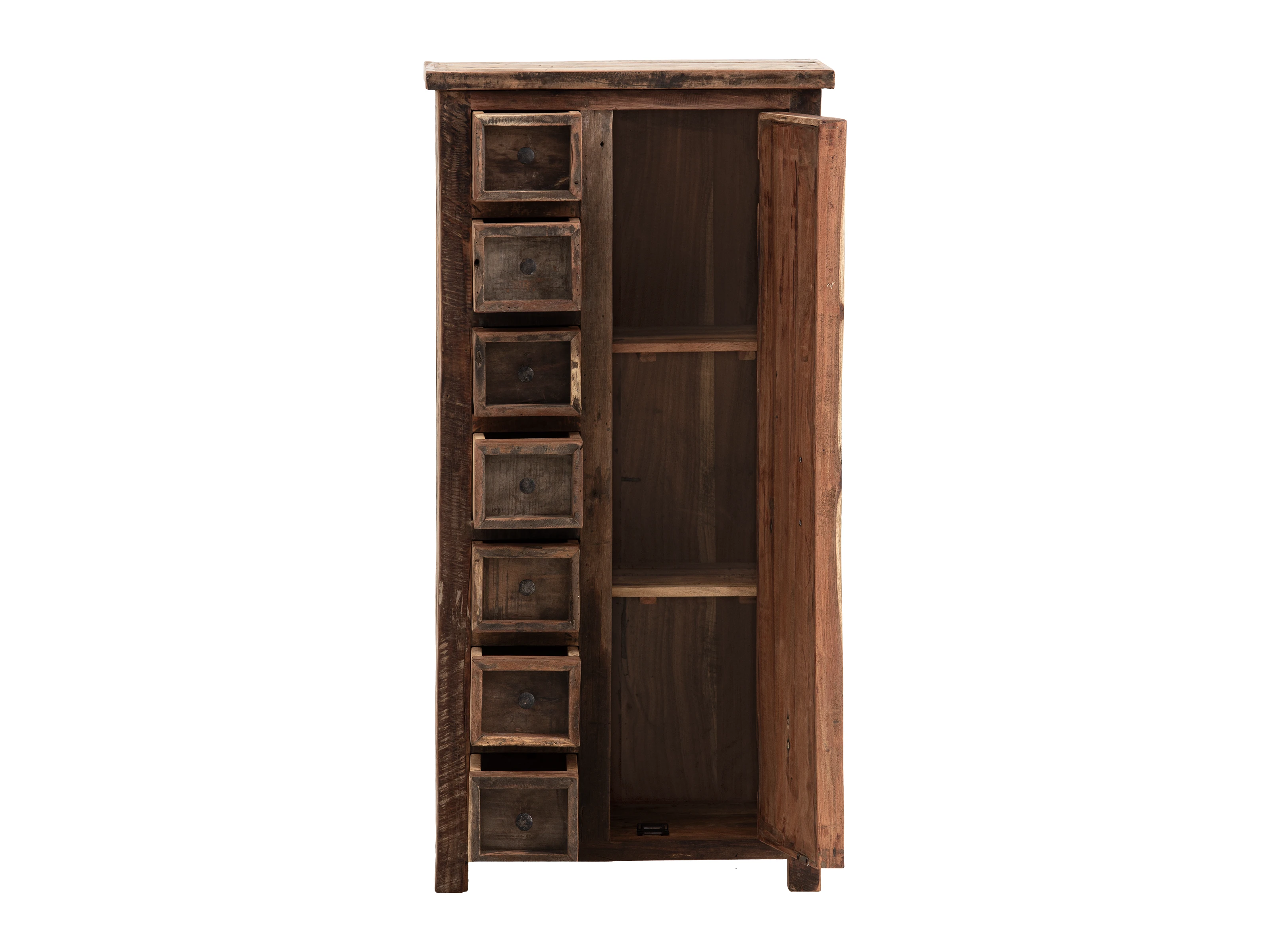 Die Hochkommode Sumatra verbindet rustikalen Charme mit praktischer Funktionalität. Gefertigt aus recyceltem Altholz, wird jedes Stück zum Unikat – die natürlichen Scharten, Holzrisse, Kerben und Löcher verleihen diesem Highboard seinen einzigartigen Charakter. Mit den Maßen 64x130x40 cm bietet es großzügigen Stauraum: Hinter der Tür und in den sieben kleinen Schubkästen findet alles seinen Platz.