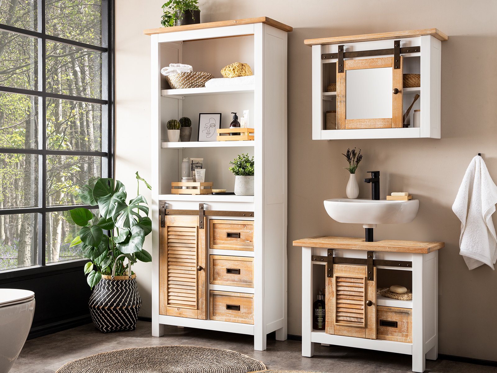 Der Hochschrank Capera überzeugt mit seinem rustikalen Charme aus massivem Pinienholz und hochwertigen MDF-Elementen. Mit den Maßen von 80x180x35 cm bietet er ausreichend Platz für all Ihre Utensilien, ob im Bad, Wohn- oder Esszimmer. Der Schrank verfügt über eine praktische Schiebetür im Scheunentor-Stil, die nicht nur optisch ein Highlight ist, sondern auch den Zugang zu drei offenen Fächern und drei Schubkästen erleichtert. Hier finden Handtücher, Kosmetik, Geschirr oder Bücher ihren perfekten Platz. Die zerlegte Lieferung erfolgt inkl. Aufbauanleitung, sodass der Schrank im Handumdrehen bereit ist, Ihren Wohnraum zu bereichern. Besonders schön lässt er sich mit den anderen Möbelstücken der Serie Capera kombinieren. Holen Sie sich ein Stück rustikalen Charme nach Hause!