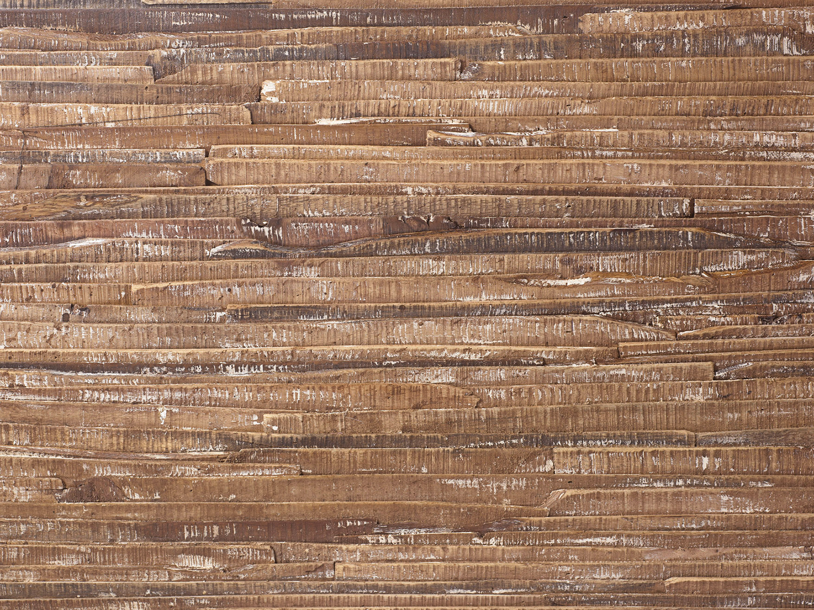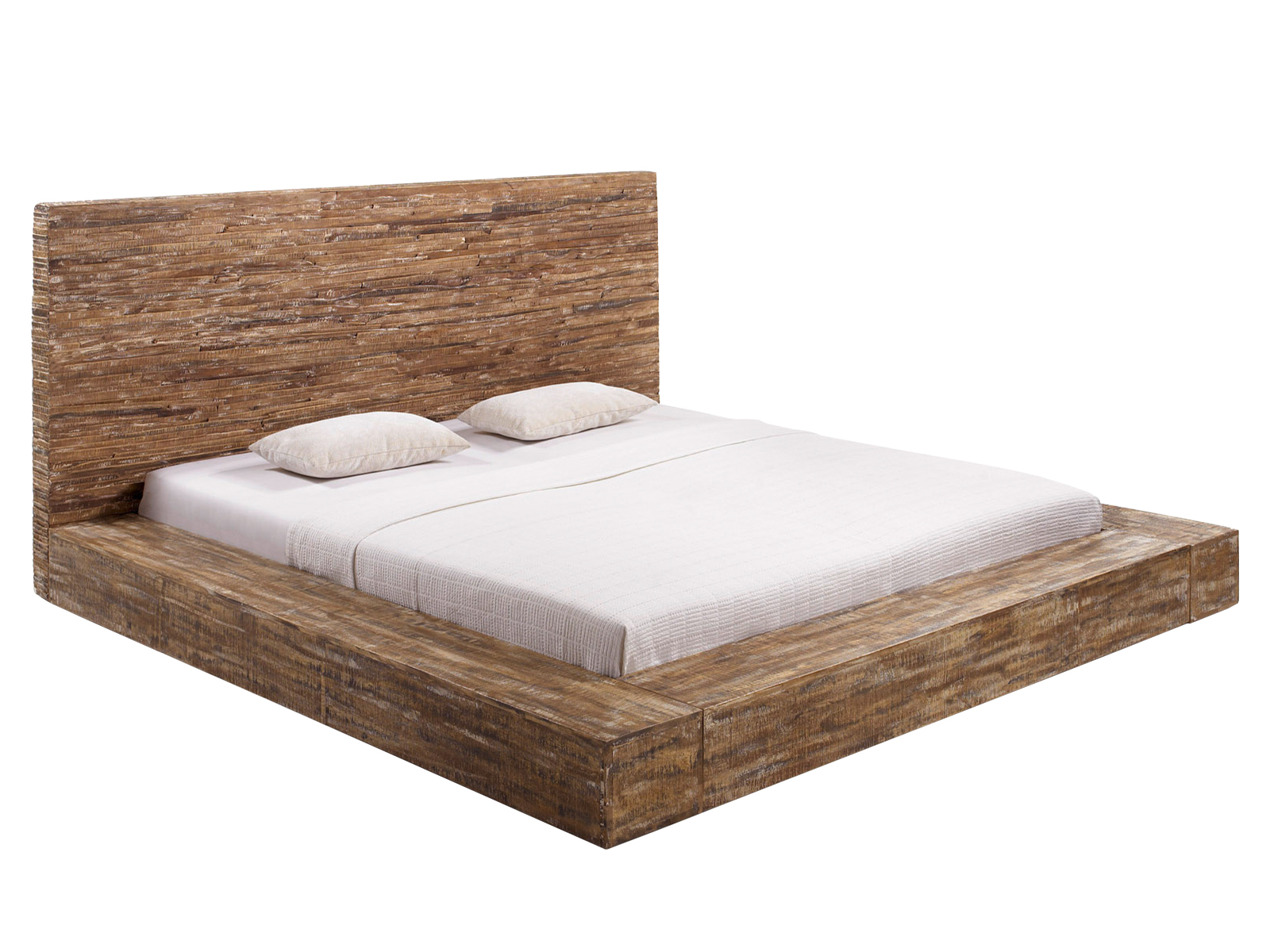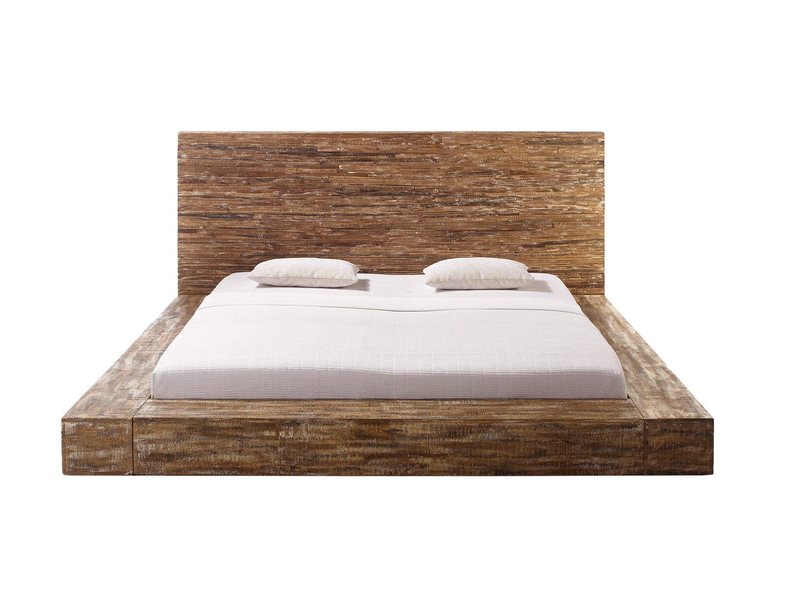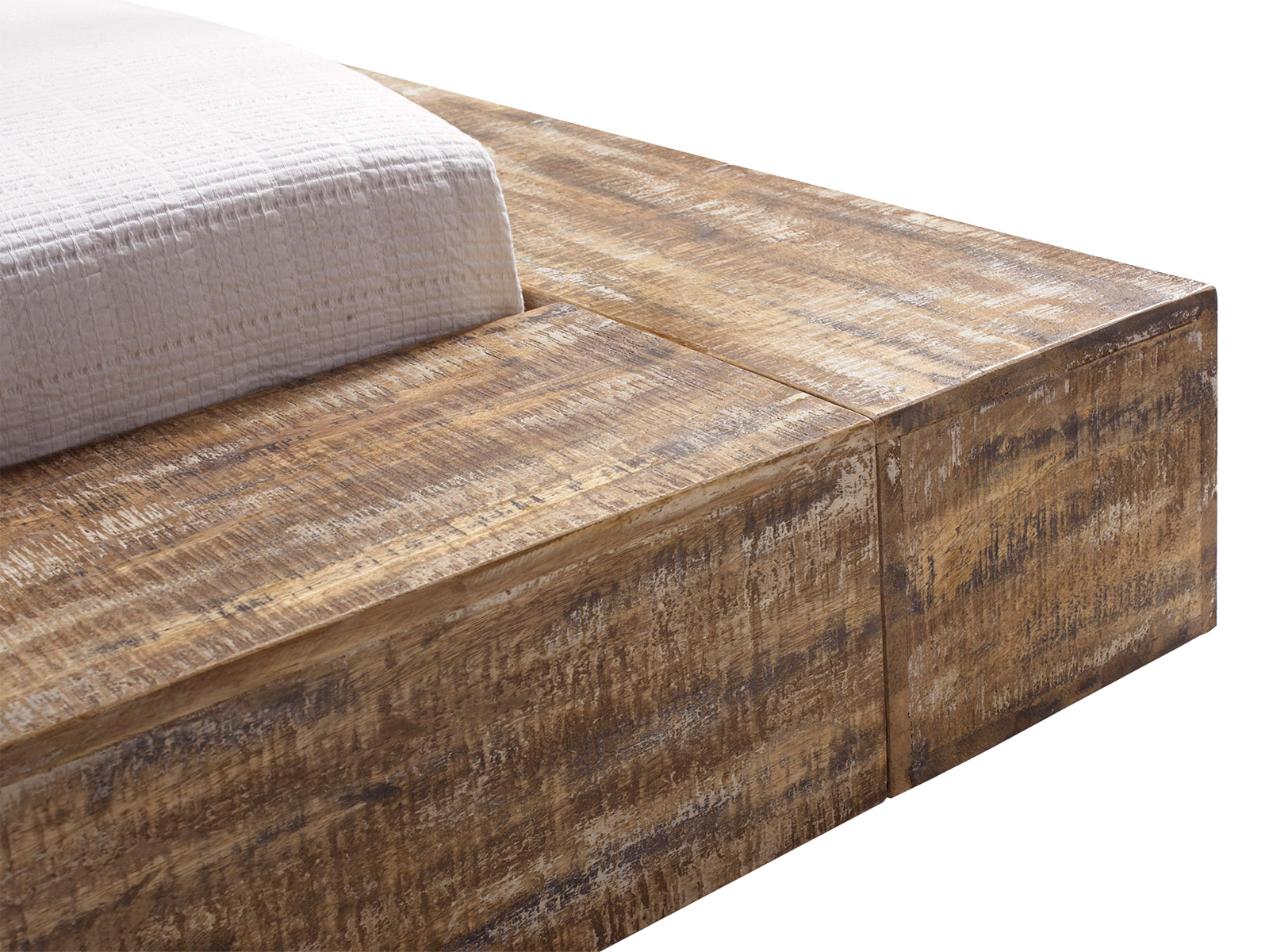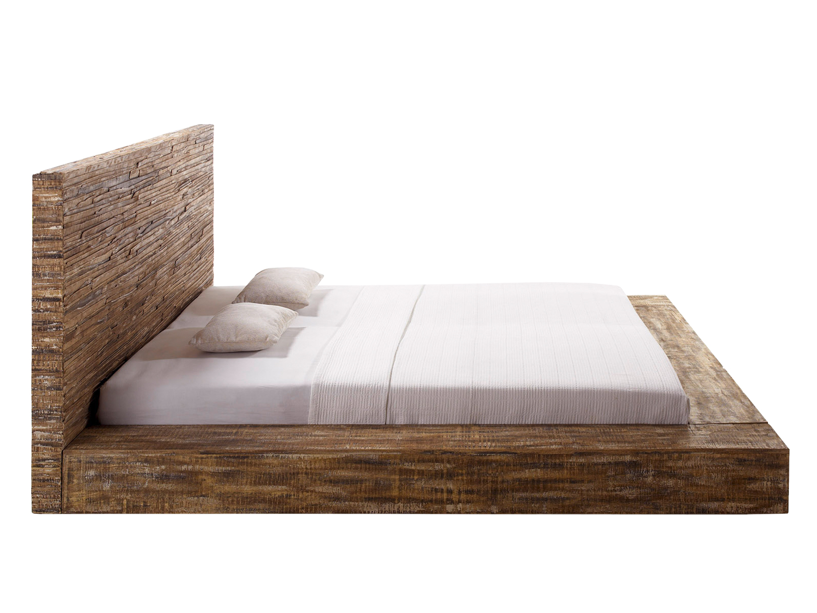 Das Doppelbett misst 230 x 110 x 235 cm (BxHxT) und verdankt seine kernige Ausstrahlung einem Mix aus drei Holzarten: Akazien-, Mango- und Pinienholz. Ihre warmen Farbnuancen in Kombination mit der gebürsteten Optik ergeben ein rustikales und natürliches Bild. Dabei unterscheidet sich die Gestaltung des Kopfteils von der des Korpus: Während das Kopfteil aus vielen einzelnen Holzelementen zusammengefügt wird und dadurch eine raue, rissige Oberfläche aufweist, werden die Seitenteile aus glatten, quaderförmigen Elementen gefertigt.