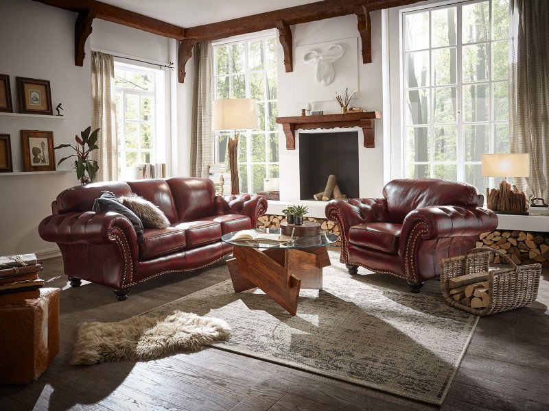 Auch gemütliche Sofas und Sessel aus natürlichen Materialien spielen beim Hüttenstil eine wichtige Rolle. Eine großzügige Sitzgarnitur aus edlem Leder im klassischen Chesterfield-Stil wie die Serie Bolton lädt zu ausgedehnten Relax-Nachmittagen mit dem Lieblingsschmöker ein – ob mit oder ohne Kaminfeuer. Die komfortablen Sitzmöbel, die in den Farben Braun, Rot und Grün als Sessel, Zwei- und Dreisitzer zu haben sind, machen auch als Einzelstück eine lässige Figur.