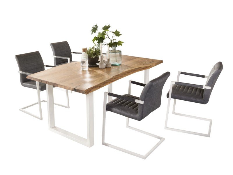 Wir haben ganz verschiedene Tischgruppen auf Lager. Das soll heißen: wir haben unterschiedlich große Tischplatten, verschiedenfarbige Füße, verschiedenfarbige Tischplatten und ganz unterschiedliche Esszimmerstühle, die an den Tischen Platz finden können.