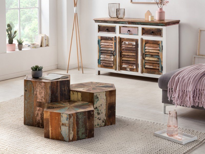 Bei der Einrichtung mit hellen Möbeln ist die Farbe Weiß eine beliebte Formel für elegantes, stilvolles und harmonisches Ambiente. Doch aufgepasst! Wer hier nicht achtsam einrichtet, erzeugt einen sterilen Look, der schnell nicht mehr wohnlich und einladend wirkt. Unsere Möbel der Serie Perth machen hier alles richtig und kombinieren einen strahlend weißen Korpus mit farbenfrohen Lamellentüren aus recyceltem Hartholz. Diese kontrastreiche Gestaltung verleiht unseren Badmöbeln Perth und der Wohnwand Perth ein lebendiges, gemütliches Strandhaus-Flair. Unterstreichen Sie den maritimen Stil der Holzmöbel durch natürliche Deko, wie Treibholz, Sand oder Muscheln aus Ihrem letzten Urlaub am Meer.