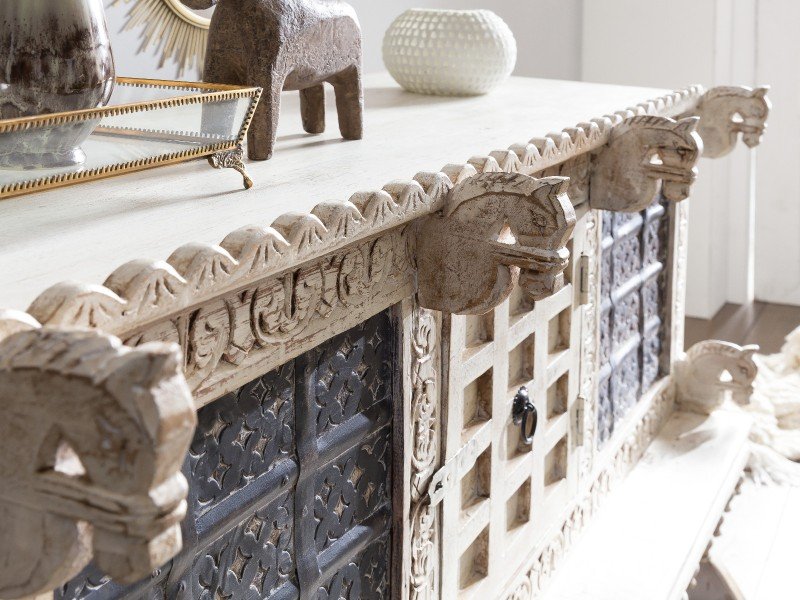 Irgendwo zwischen mediterraner Leichtigkeit und orientalischer Exotik lädt unsere Möbelserie Damchaya zum Träumen ein. Mit warmem Mangoholz und verspielten Schnitzereien entführen diese Holzmöbel Ihre Sinne auf eine Reise in weit entfernte, geheimnisvolle Länder und Zeiten. Zudem beweisen unsere Kommode und TV-Bank Damchaya: Möbel müssen nicht dezent sein, um ein helles, offenes Raumgefühl zu schaffen. Durch die weiße Lackierung der Massivholzmöbel wird das Licht reflektiert und Ihre Wohnräume werden optisch geöffnet und vergrößert. So schaffen sich diese prunkvollen Einzelstücke selbst Raum, um ausgiebig bewundert zu werden.