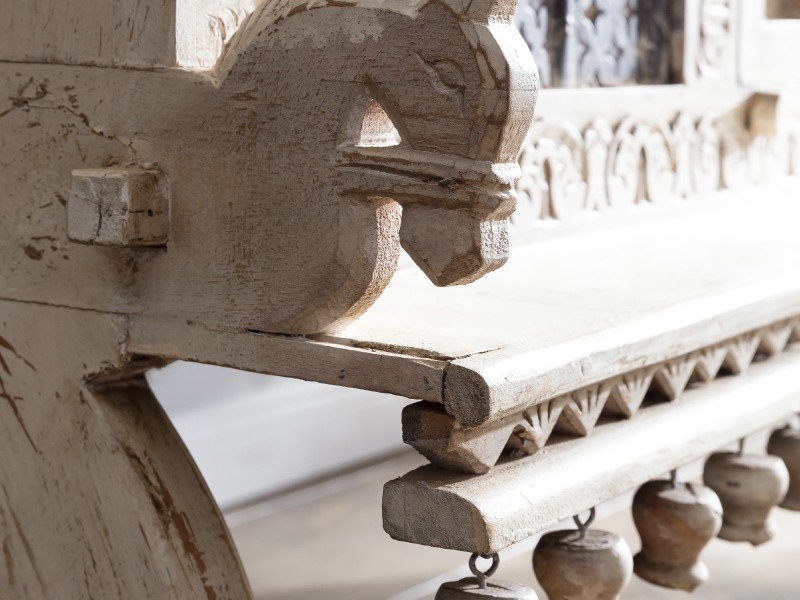 Wenn Sie sich für einen minimalistischen, eleganten Look entscheiden wollen, legen wir Ihnen unsere Flurmöbel Mackay ans Herz. Die Möbel wurden mit weißer Vintage-Farbe lackiert, sodass die natürliche Maserung des warmen Mangoholzes nicht verloren geht. Im Zusammenspiel mit handgefertigten Schnitzereien schaffen die weißen Möbel so eine einladende, herzliche Atmosphäre in Ihrem Flur. Besonders Ihr Eingangsbereich profitiert von der Wirkung weißer Möbel: Das hell lackierte Massivholz strahlt Ruhe, Ordnung und Klarheit aus, die Sie umfängt, sobald Sie über die Türschwelle treten. Natürlich helfen auch die cleveren Haken unserer Wandpaneele Mackay und der Stauraum in unserer Truhe Mackay, die Ordnung in jeder Garderobe zu wahren.