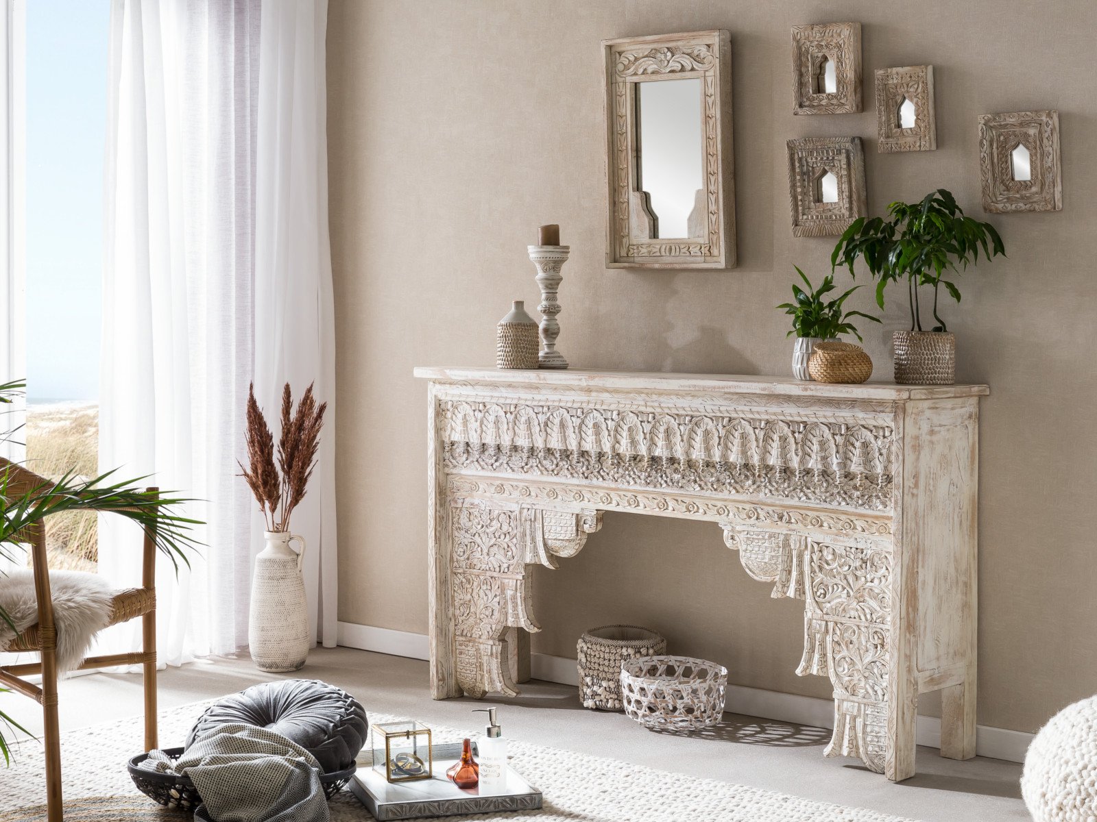 Bei der Konsole Damchaya wird das harte MANGOHOLZ durch eine helle Lackierung und einzigartige Schnitzereien aufgewertet. Jede Gebrauchsspur wird diesem Muster im Lauf der Zeit nur ein neues Ornament hinzufügen. Im Bett Madras halten robuste Balken aus dem eher weichem Pinienholz Ihnen den Rücken frei und sorgen für soliden Schlaf.