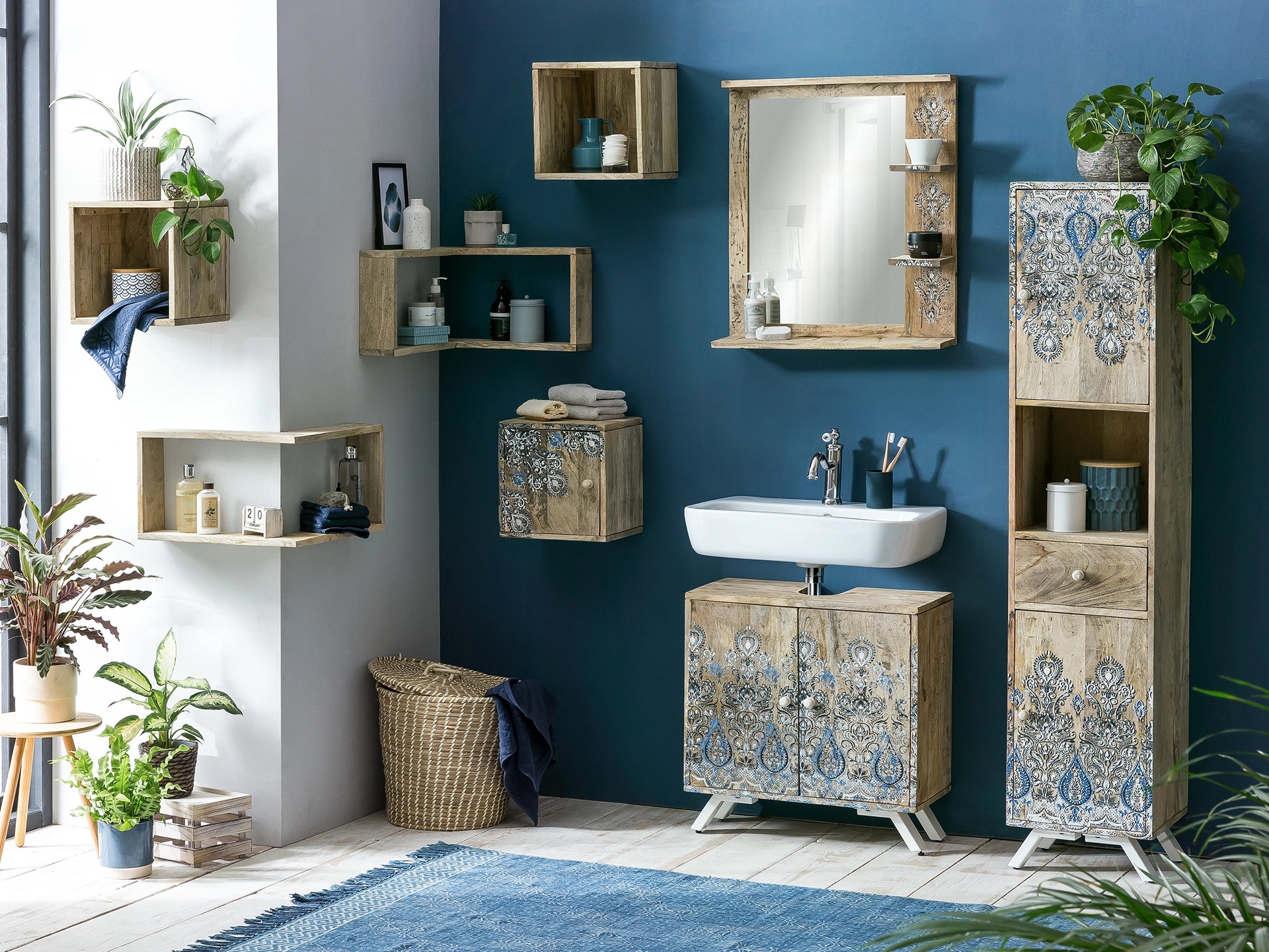 Doch Sie müssen sich nicht auf ein Ton-in-Ton-Konzept beschränken: Starke Akzente und ein einheitliches Gestaltungsthema können das Auge geschickt vom Platzmangel ablenken. Unsere Badmöbel Alcudia kombinieren eine strahlend weiß gekalkte Oberfläche mit selbstbewussten Mustern in Pastellblau. Die filigranen Verzierungen und eleganten Holzfüße sorgen auch auf engstem Raum für mediterranen Flair.