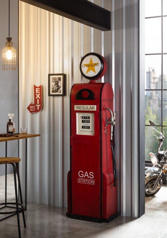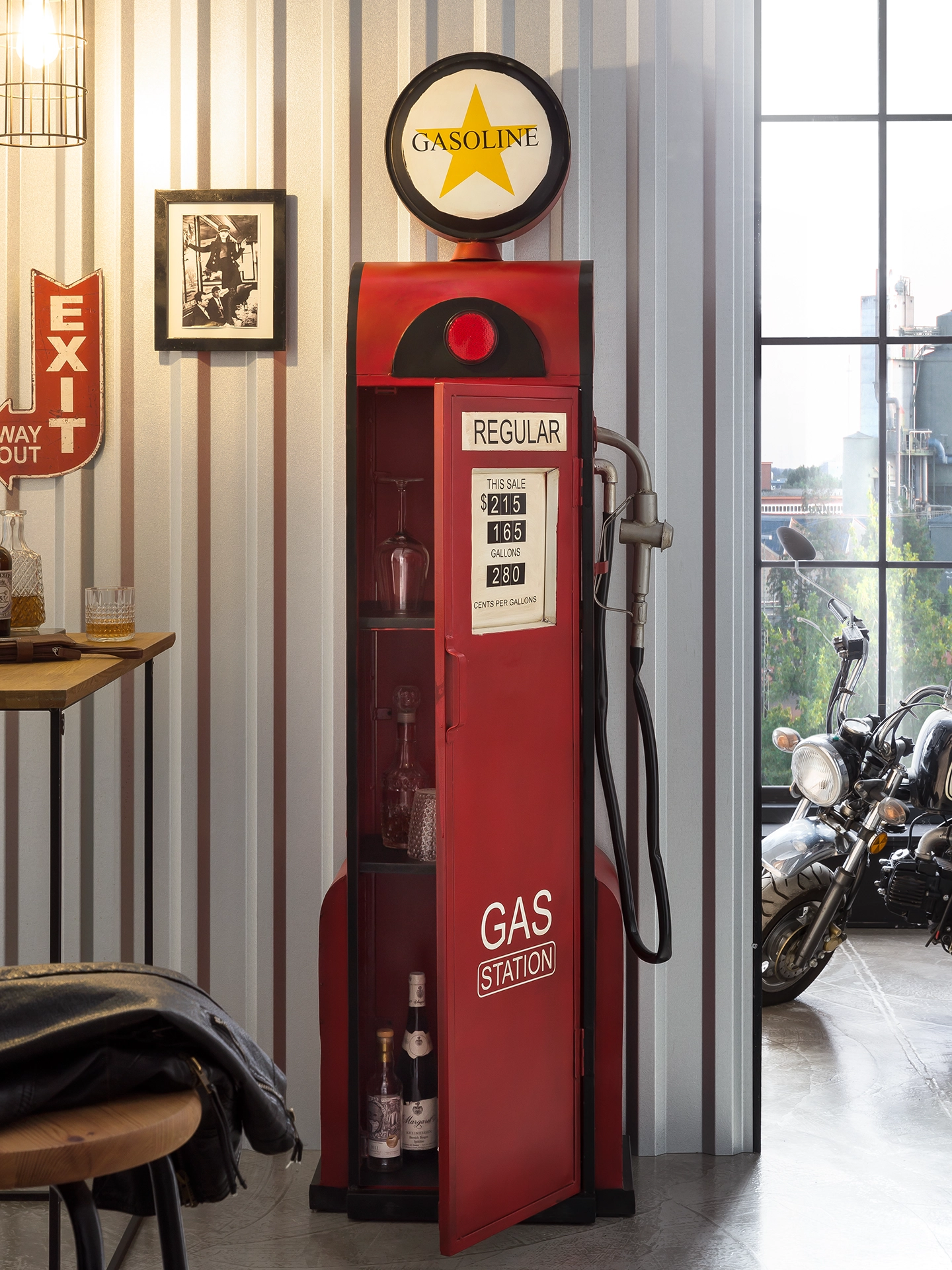 Der Abend neigt sich dem Ende und die Bar ist nicht mehr besetzt? Bieten Sie mit unserem Barregal Zapfsäule Ihren Gästen die Möglichkeit, selbstständig aufzutanken. Der Vintage-Stil des Barmöbels ist einer alten Zapfsäule aus den USA entlehnt und aus recyceltem Echtholz und Metallen gefertigt. Der ergiebige Stauraum hinter roten Türen bietet für Sie und Ihre Gäste ein Barregal der unbegrenzten Möglichkeiten