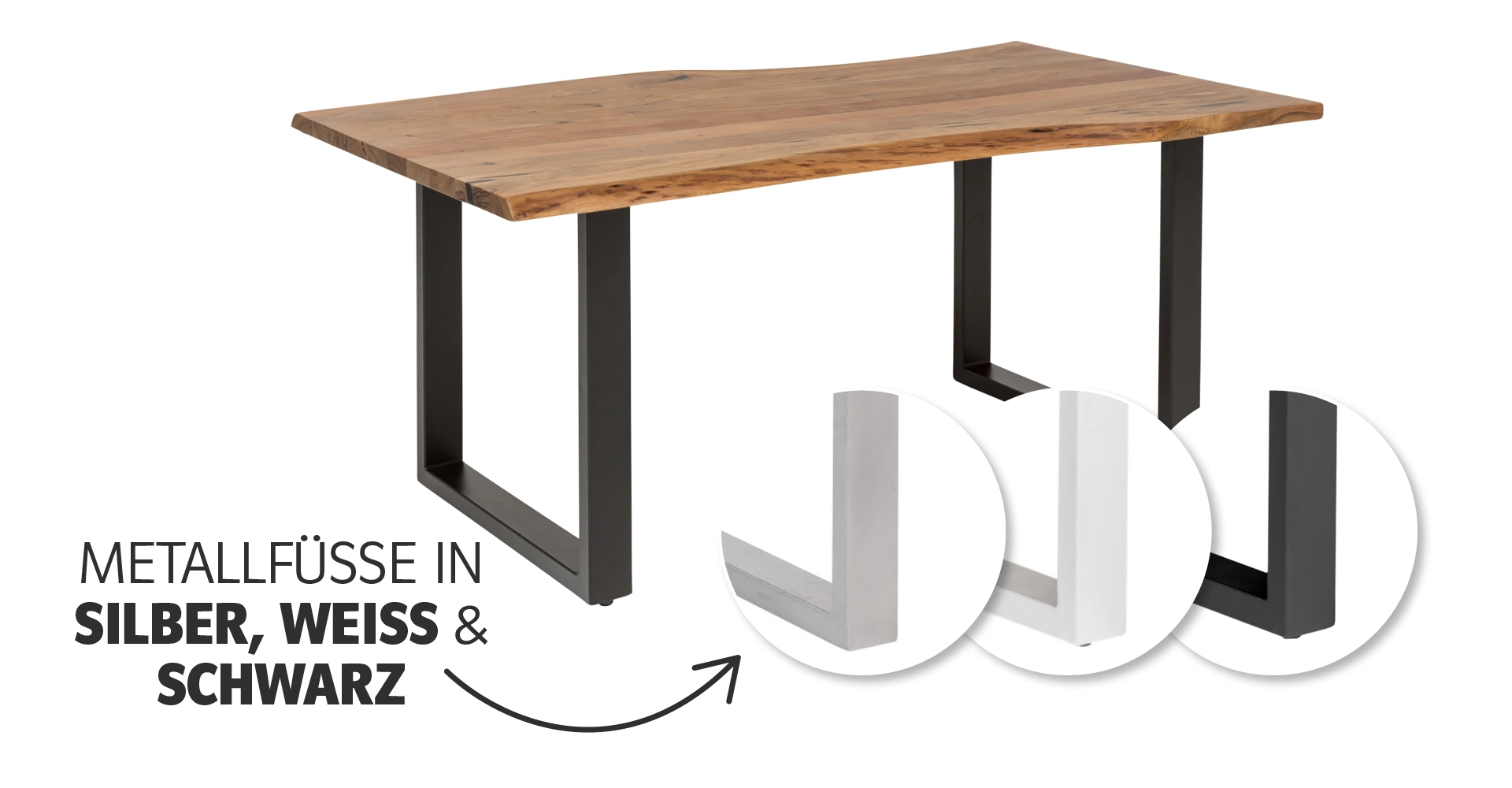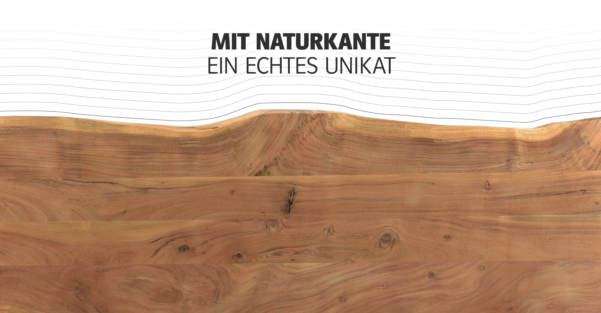 Ein Tisch mit Naturkante überzeugt nicht nur durch die natürliche Maserung des Holzes, gerade die natürlich geschwungene Form, die sich aus dem Wuchs des Baumstamms ergibt, ist ein Blickfang. Authentisch und charakterstark bittet er Sie zu Tisch.