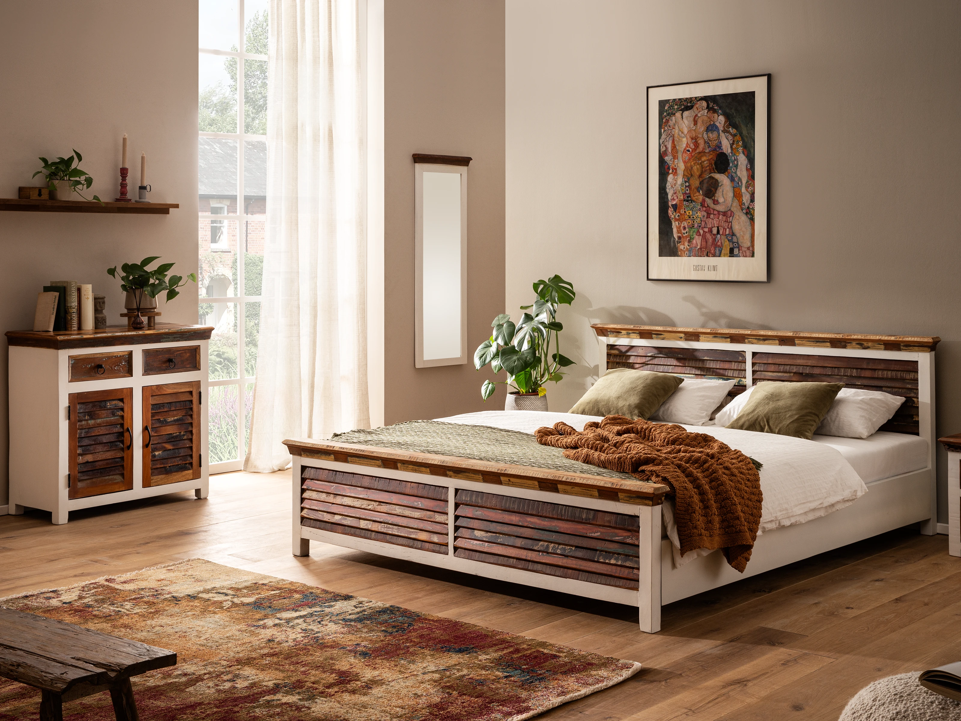 Die Kommode Perth besticht mit eigener Handschrift: Urig, originell und massiv. Wunderbarer Wohnstil mit eigener Handschrift in einzigartigem Design. Im Antik-Look mit farbigen Flächen und weißen Rahmen geben die Möbel der Serie Perth jedem Wohnraum eine faszinierende Note. Das Möbelstück ist massiv aus recycelten Hölzern gefertigt welche vorwiegend aus alten Türen, alten Möbeln oder auch aus alten Fischerbooten neu verarbeitet wurden.