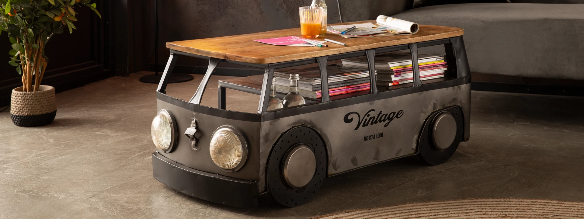 Camper-Couchtisch aus Holz in wohnlicher Ambiente – kompakter, moderner Couchtisch fürs Wohnzimmer mit klaren Linien