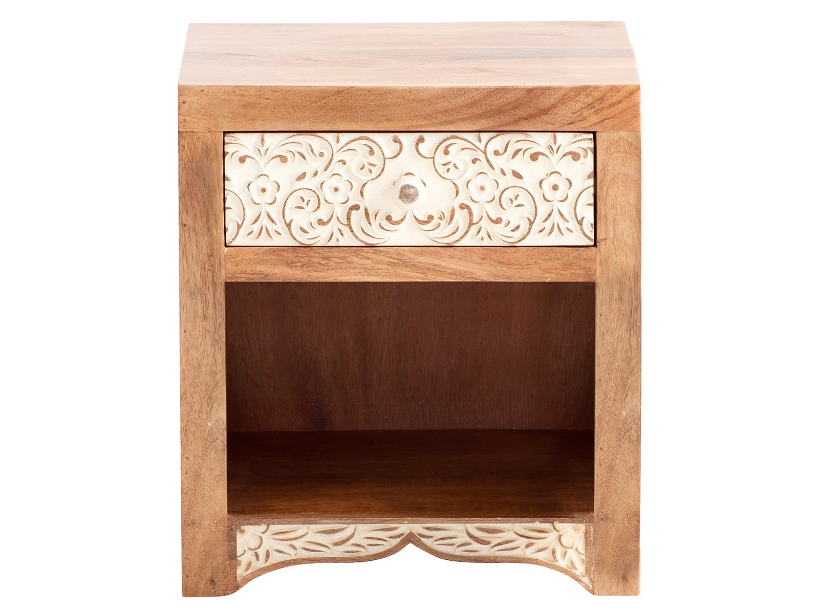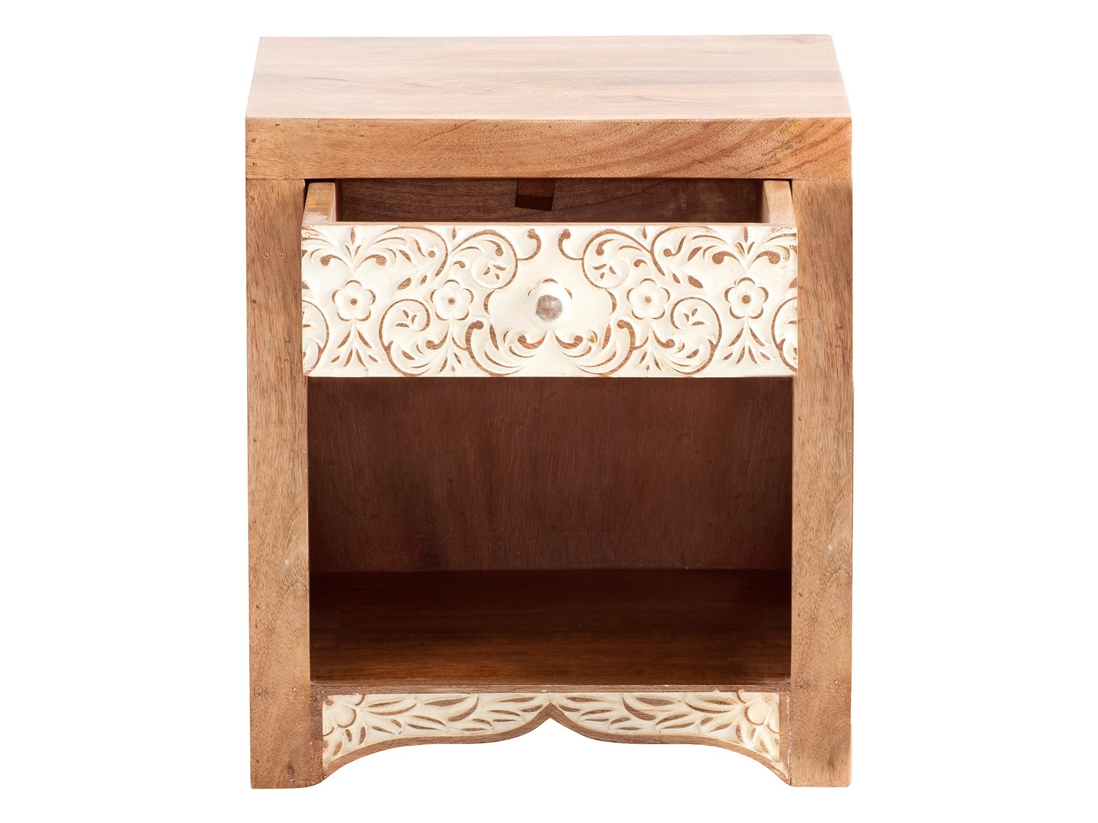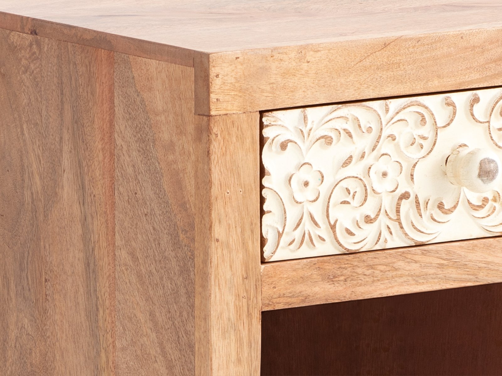 Entdecken Sie mit dem Nachttisch Delhi den Charme des Landhausstils, kombiniert mit praktischem Design. Dieses Stück fügt sich nahtlos in Ihr Schlafzimmer ein und bietet mit seinen liebevollen Schnitzereien nicht nur optisch ein Highlight. Ein diskreter Stauraum im Schubkasten sowie ein offenes Fach bieten genügend Platz für Ihre Brille, Lieblingsbücher und mehr. Die Ablagefläche hält zudem ausreichend Platz für eine Lampe bereit.
