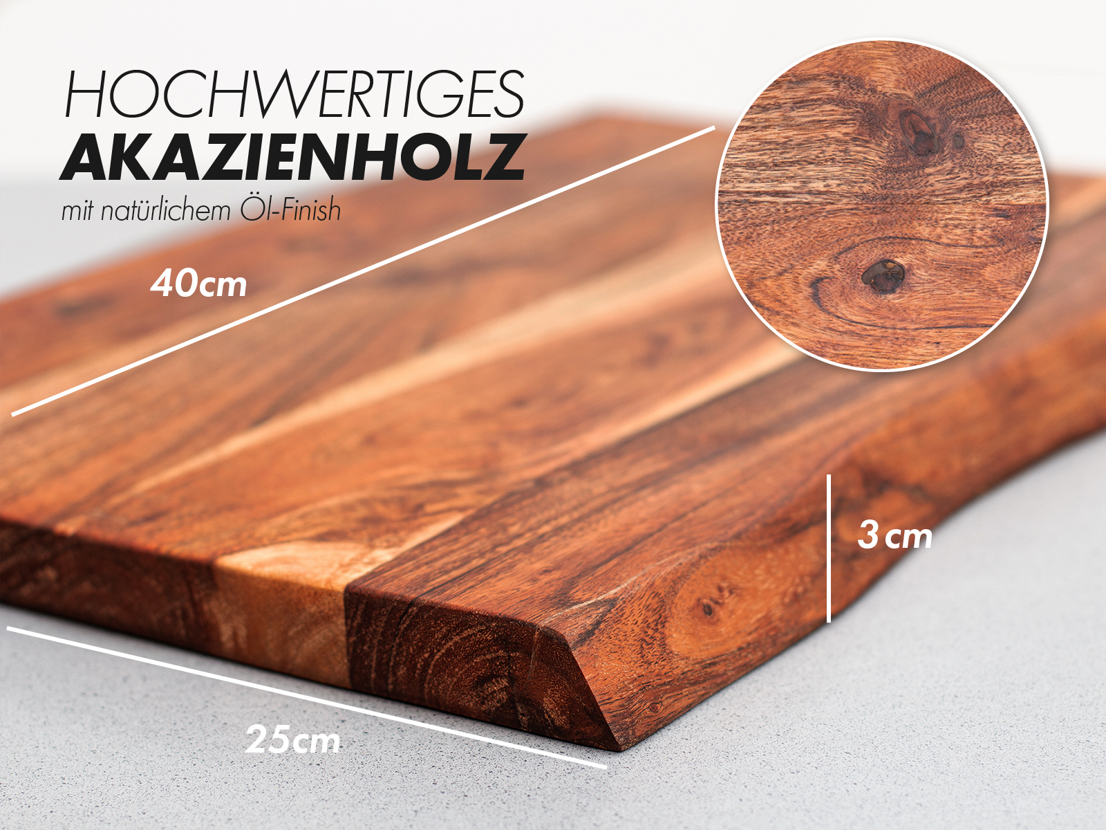 Verschönern Sie Ihre Küche oder deinen Esstisch mit diesem langlebigen, stilvollen und funktionalen Schneidebrett oder Serviertablett aus Akazienholz mit lebendigen Baumkanten. Beide Seiten des Bretts eignen sich zum Hacken, Schneiden oder Servieren deiner Lieblingsspeisen. Ihr Messer muss weniger geschärft werden, da Schneidebretter aus Holz weniger stumpf sind als Schneidebretter aus Kunststoff. Alle unsere Schneidebretter sind mit einem lebensmittelechten Naturöl-Finish geschützt.