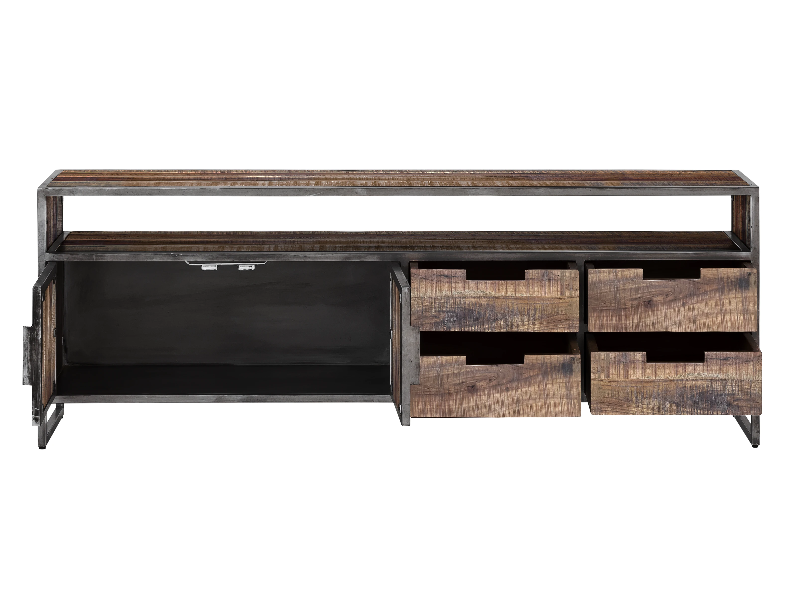 Entdecken Sie mit der TV-Bank York ein stilvolles Möbelstück, das Funktion und Design perfekt vereint. Gefertigt aus massivem Akazienholz, überzeugt dieses TV-Möbel mit seiner markanten Sägeoptik und dem stabilen Metallrahmen. Zwei Türen, vier Schubladen und eine offene Ablage bieten großzügigen Stauraum für Technik, Bücher oder Dekoration. Die Kombination aus Landhaus- und Industriestil verleiht Ihrem Wohnzimmer eine besondere Atmosphäre. Dank der lackierten Oberfläche ist der Massivholzschrank nicht nur pflegeleicht, sondern auch langlebig. Ergänzen Sie Ihre Einrichtung mit weiteren Möbeln der Serie York und schaffen Sie ein harmonisches Gesamtbild.
