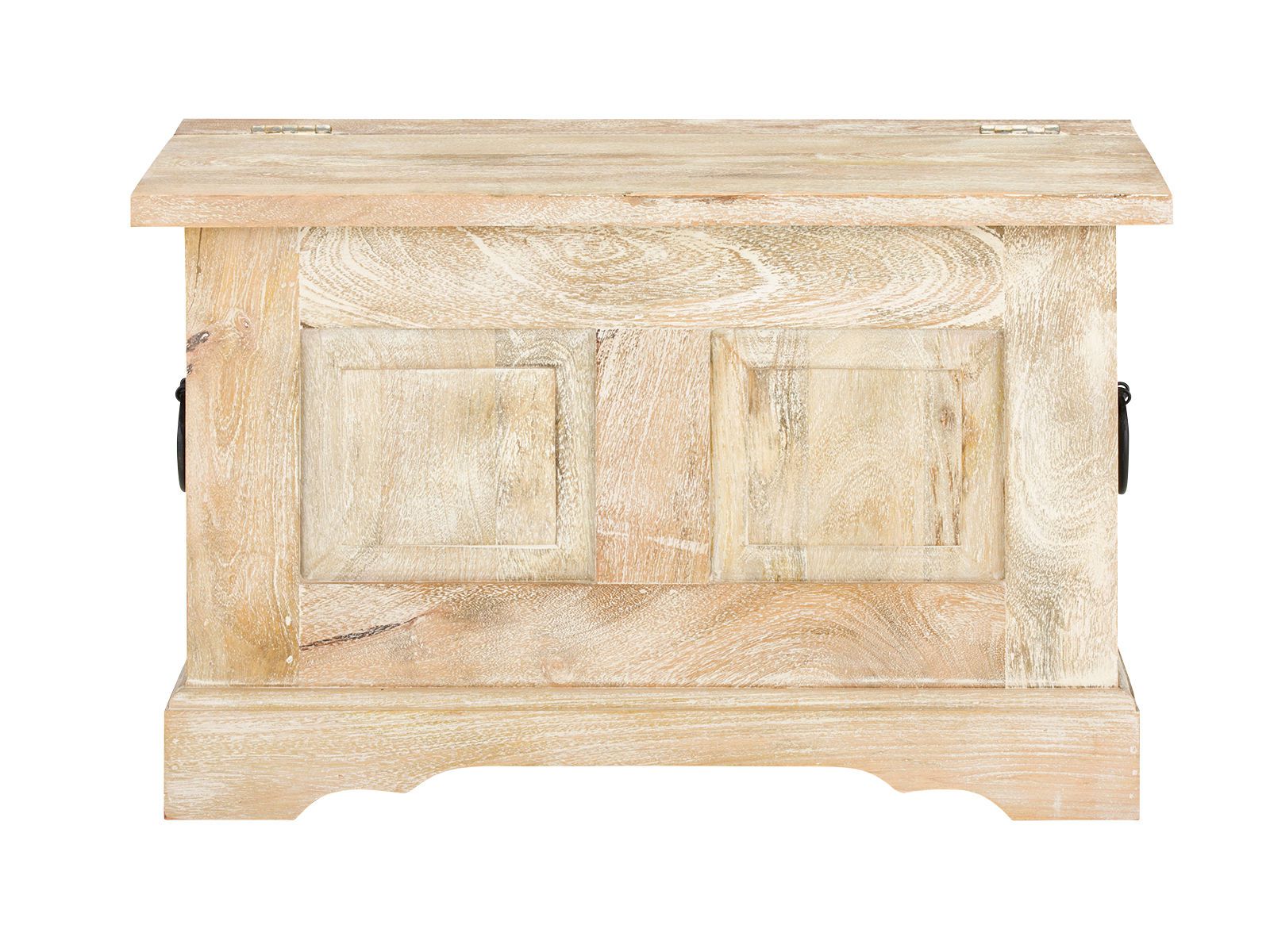 Die Truhe ist aus massivem Mangoholz gefertigt und zeigt eine helle, mediterrane Patina mit sichtbarer Maserung. Die Holztruhe misst 80 x 50 x 45 cm und wirkt wie ein kleiner Schatzkoffer im Raum. So siehst du sofort, wie viel Platz du innen etwa erwartest und wie gut die Proportionen im Zimmer wirken.