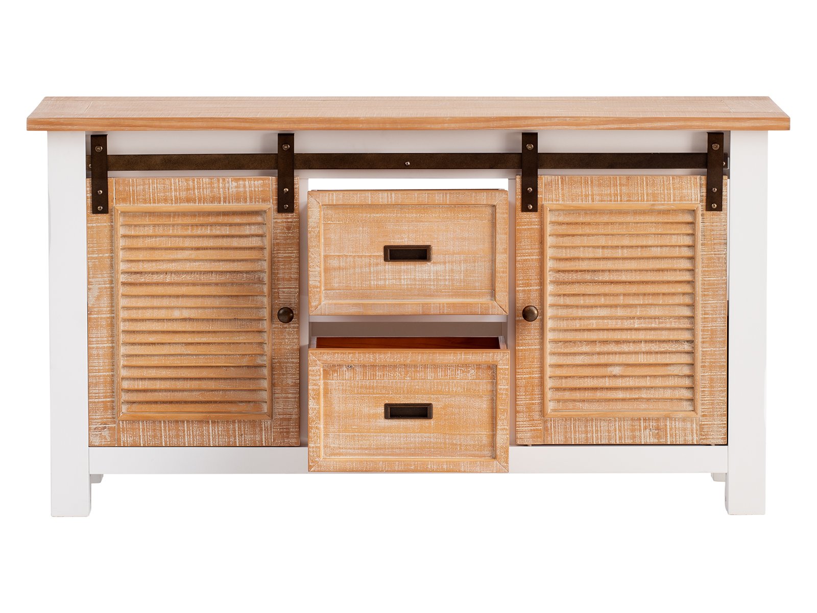 Der Waschtisch Capera vereint Funktionalität mit einem Hauch von Landhaus-Charme. Ausgestattet mit zwei Lamellen-Schiebetüren im angesagten Farmhaus-Stil und zwei praktischen Schubkästen, bietet dieser Waschtisch nicht nur ausreichend Stauraum, sondern setzt auch ästhetische Akzente in Ihrem Badezimmer. Der Korpus aus weiß lackiertem Pinienholz und MDF harmoniert perfekt mit den Fronten und der Ablage aus braunem Pinienholz.