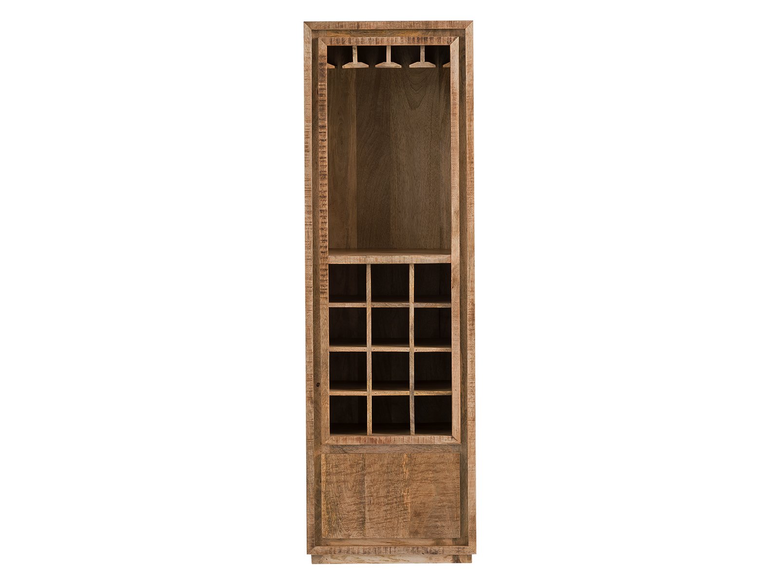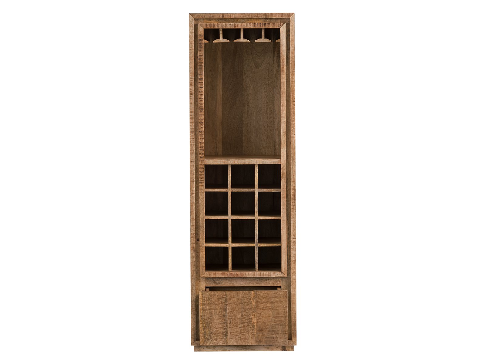 Der Schrank ist aus Massivholz gefertigt und hat eine natürliche, rustikal wirkende Oberfläche. Reinige das Möbelstück mit einem leicht feuchten Tuch und trockne sofort nach, um die Holzoberfläche zu schützen. Als Weinschrank, Highboard und Weinregal bleibt es so lange schön und stabil, ein echtes Barmöbel mit Massivholz-Qualität.