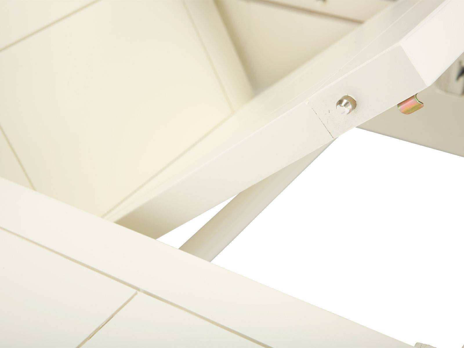 - Möglich ist auch ein Kulissentisch mit Tischplatten, die im kompakten Zustand heruntergeklappt sind und sich zum Vergrößern hochklappen lassen.