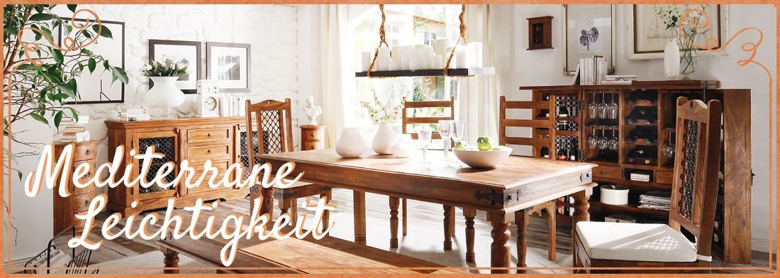 Der mediterrane Stil lebt von natürlichen Materialien wie Holz, Geflecht und Naturstein sowie hellen Farben. Warme Erdtöne wie Creme, Terrakotta und Ocker schaffen ein gemütliches Ambiente und runden mit auffallend detailreichen Landhausmöbeln mit gedrechselten Beinen oder Metallapplikationen das Gesamtbild stilvoll ab.