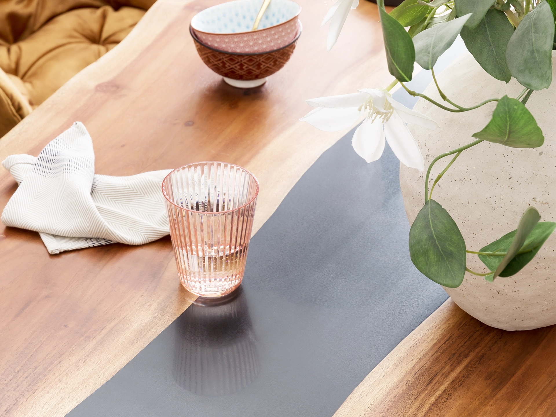 Tipp: Eine platzsparende Lösung für kleine Wohnungen bilden Massivholz-Esstische mit Hockern, die bei Nichtgebrauch unter den Tisch gestellt werden. So können sich auch in einer studentischen Einraumwohnung bis zu acht Personen gemütlich zusammensetzen.