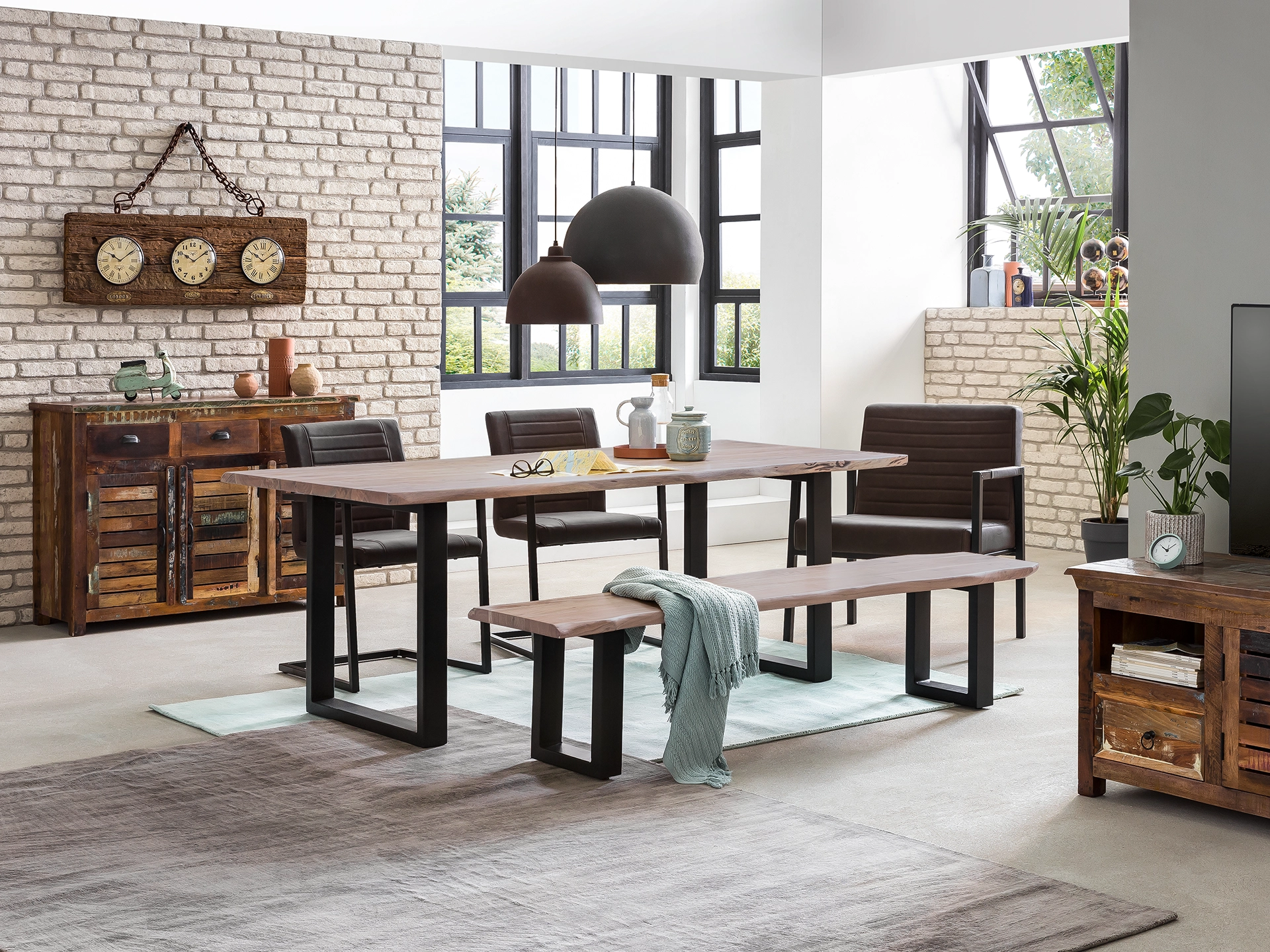- Große Tische aus Massivholz, die man früher nur mit dem Landhausstil in Verbindung brachte, können heutzutage problemlos auch in einem Esszimmer im Loft-Style stehen, wenn sie mit dem sachlichen, rauen Design der übrigen Einrichtung harmonieren. Leichte Polstersessel auf schlanken Beinen oder Schwingstühle mit Edelstahlgestell bilden eine tolle Ergänzung.